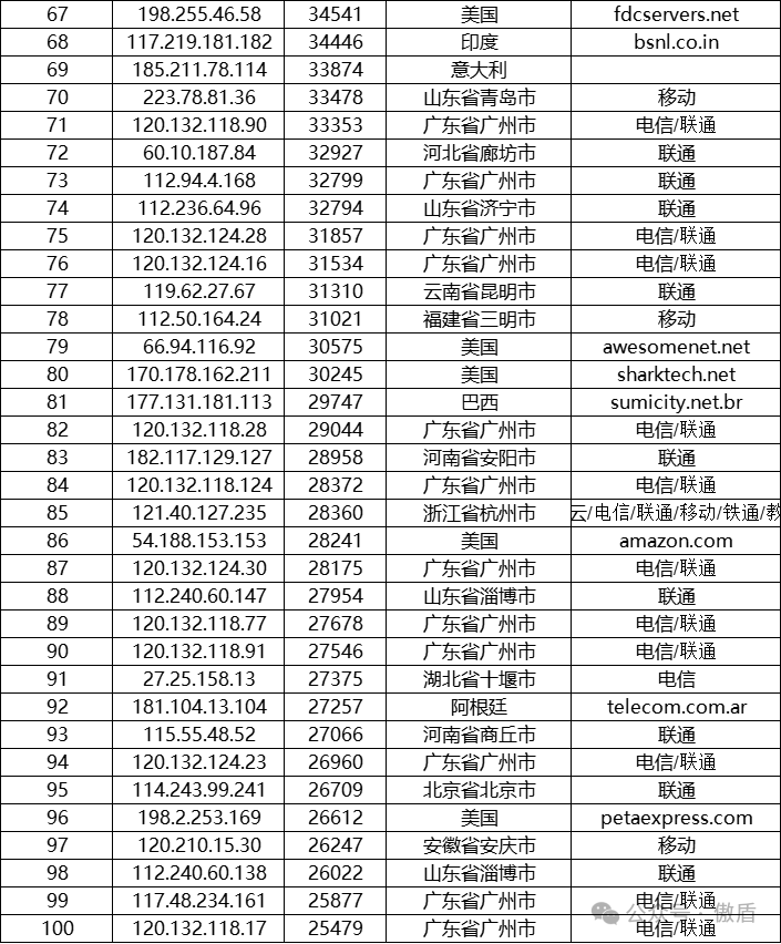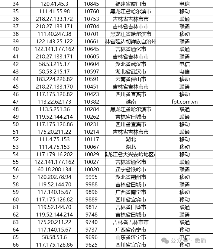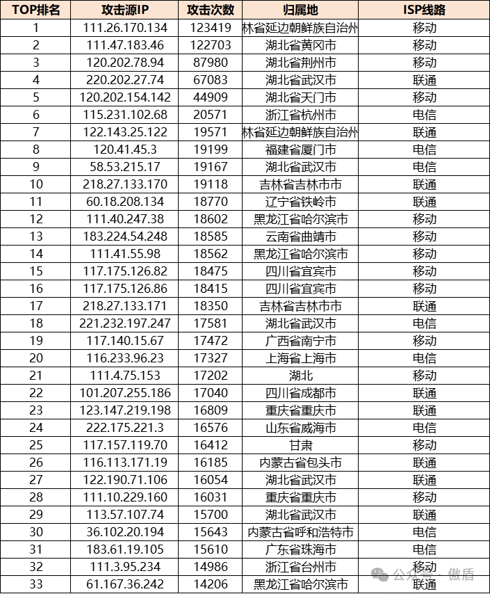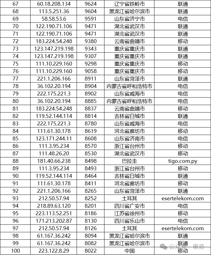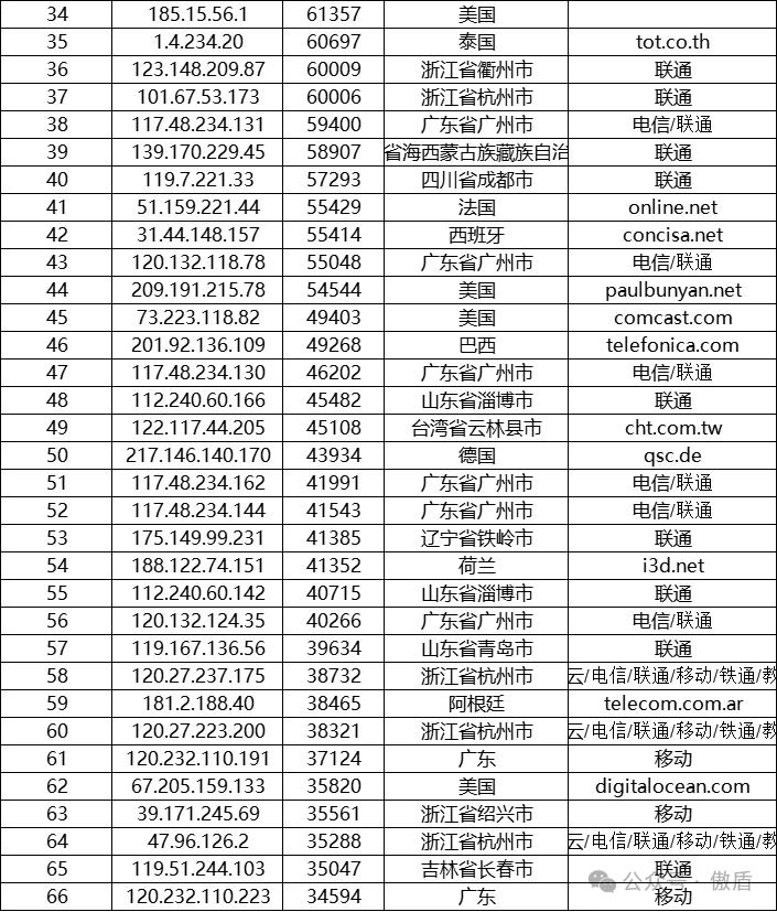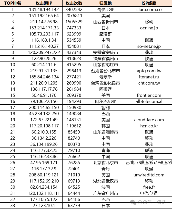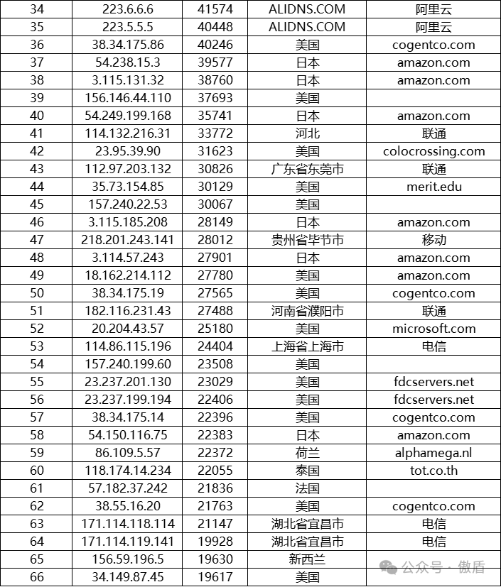 注:因IP地理位置库时效性原因属地与ISP线路仅供参考,另因DDoS攻击存在虚假源的可能,如引用下方攻击源数据至网络安全设备中,由此产生的风险与傲盾软件无关。