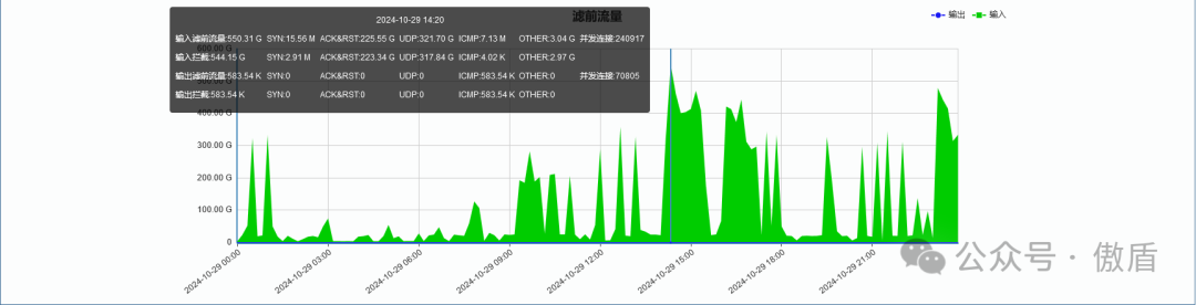 ►单次最大攻击流量-联通方向 550.31G于2024-10-29 12:20
