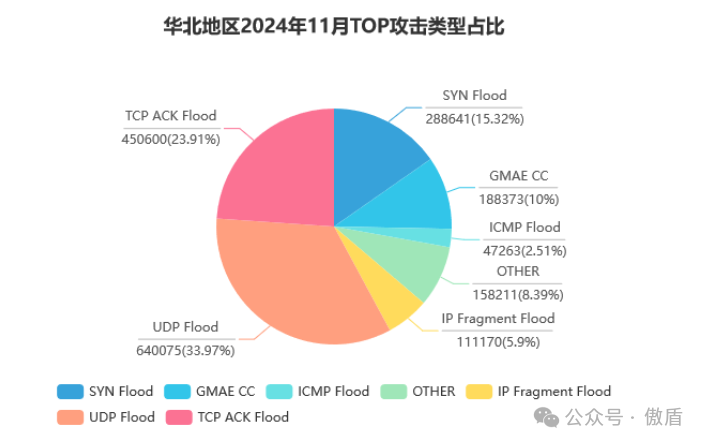 华北区域在11月内的攻击总次数达到2600969次,显著高于其他区域,表明该区域可能成为攻击的主要目标。为了使该地区在猖狂的网络攻击中网络服务更加安全, 需要改善并加强华北地区的网络防护和基础设施,做到未雨绸缪,才能在如此庞大的网络攻击中保证网络不受波动。