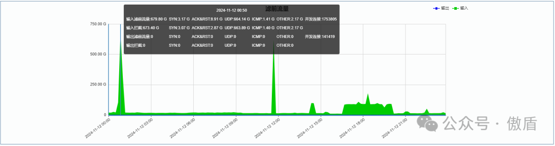 ►单次最大攻击流量 679.80 G 发生于 2024-11-12 00:50