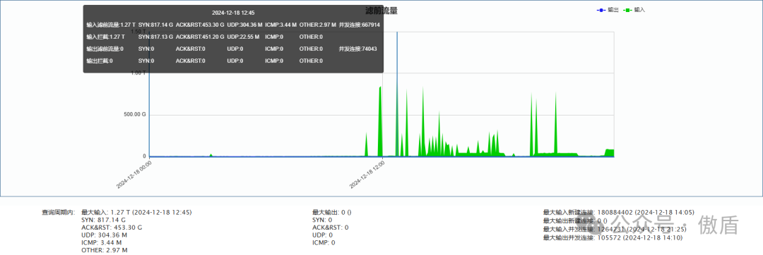►单次最大攻击流量1.27 T 发生于 2024-12-18 12:45