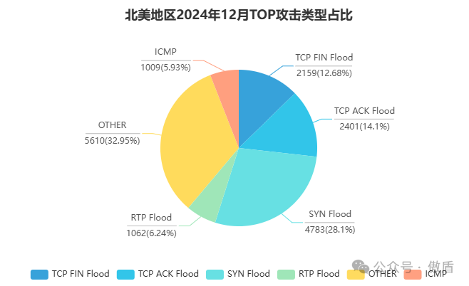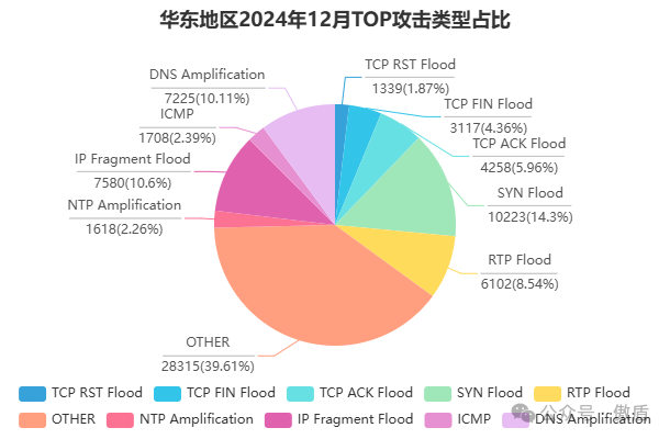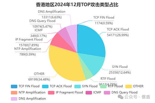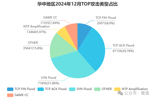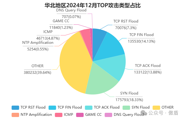 从攻击类型占比来看,常见的DDoS攻击类型如UDP Flood、SYN Flood 和 HTTP Flood 占据主导地位。这些攻击类型利用协议漏洞或资源耗尽的原理, 对目标网络和服务器造成极大的压力。本月,针对Web服务的HTTP Flood攻击尤为突出,对线上业务稳定性构成重大威胁。