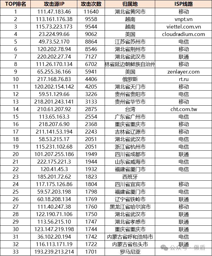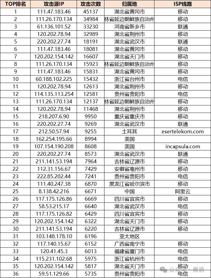 本月TOP攻击源显示,攻击IP地址分布范围广泛,既包含国内IP地址(如湖北省黄冈市、吉林省延边市),也包括多个境外IP来源(如美国、日本和巴西)。 其中,归属地显示为湖北省黄冈市的IP地址(111.47.183.46)高频出现,攻击次数达到45,137次,显示出特定区域内存在高密度攻击源节点。此外, 国外IP来源的高频出现也说明了全球化的攻击趋势与多点协同攻击的复杂性。