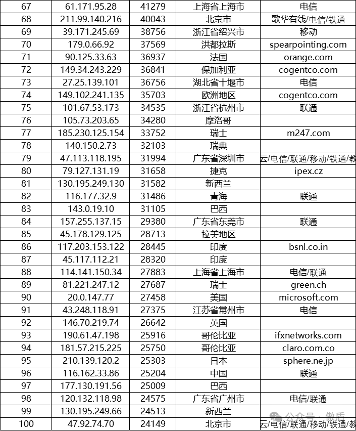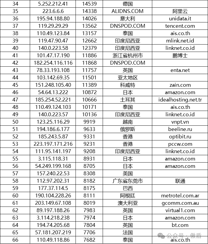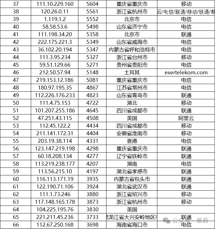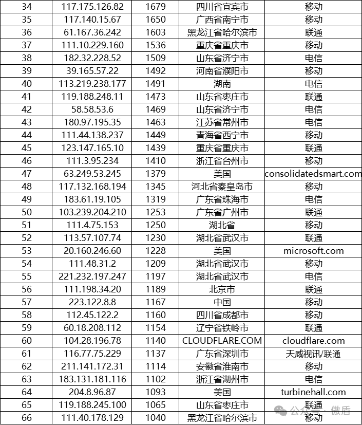 注:因IP地理位置库时效性原因属地与ISP线路仅供参考,另因DDoS攻击存在虚假源的可能,如引用下方攻击源数据至网络安全设备中,由此产生的风险与傲盾软件无关。
