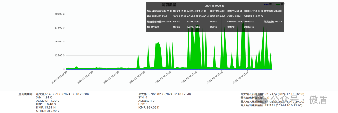 ►单次最大攻击流量-联通方向 437.71G于2024-12-10 20:30