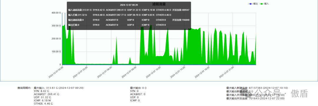 ►单次最大攻击流量-电信方向313.61 G 于2024-12-07 00:20
