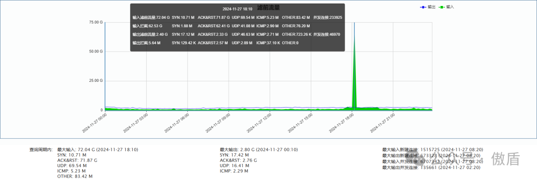 ►单次最大攻击流量 72.04G 发生于 2024-11-27 18:10