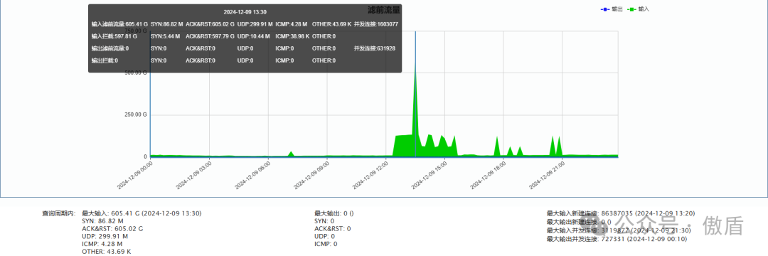 ►单次最大攻击流量 605.41 G 发生于 2024-12-09 13:30