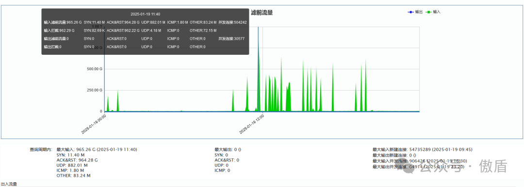 ►单次最大攻击流量965.26 G发生于 2025-01-19 11:40