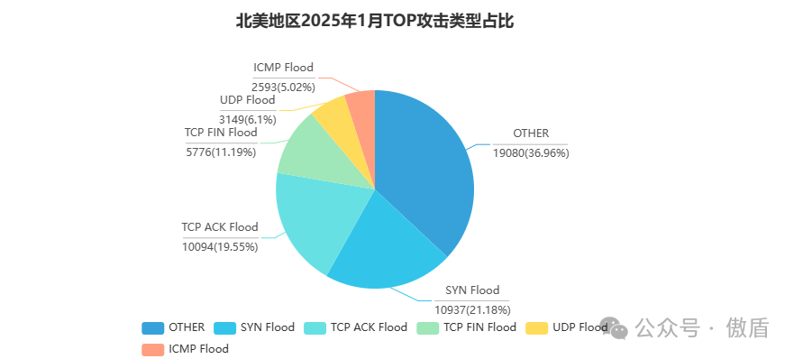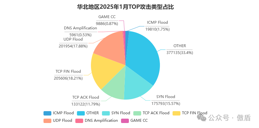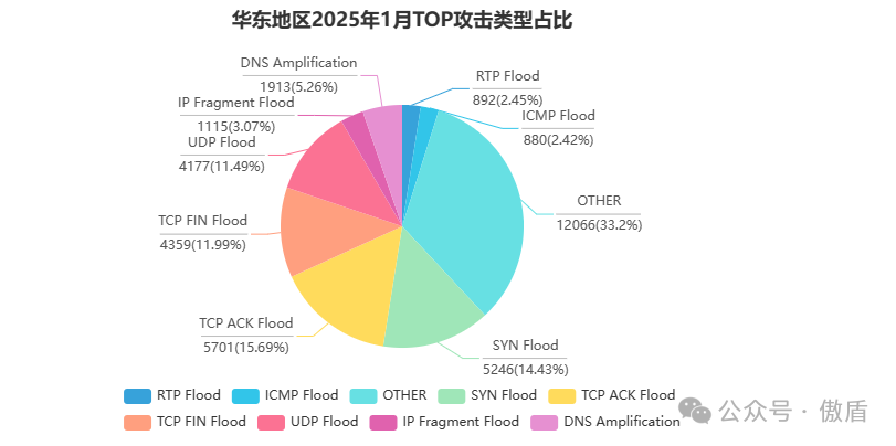 从攻击类型占比来看,常见的DDoS攻击类型如UDP Flood、SYN Flood 和 OTHER 占据主导地位。这些攻击类型利用协议漏洞或资源耗尽的原理, 对目标网络和服务器造成极大的压力。