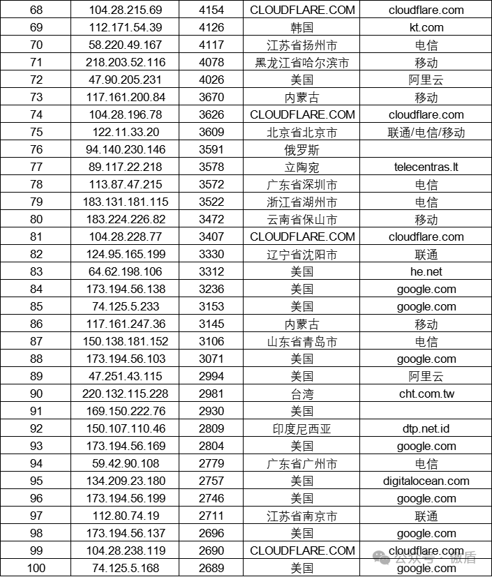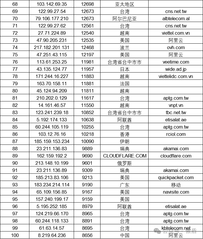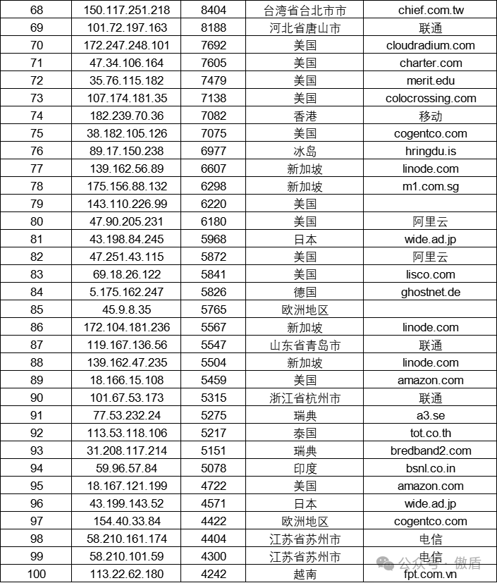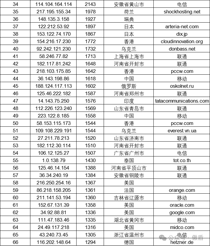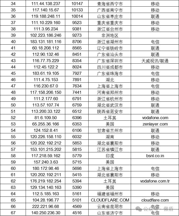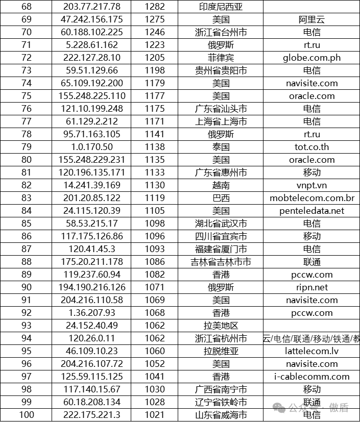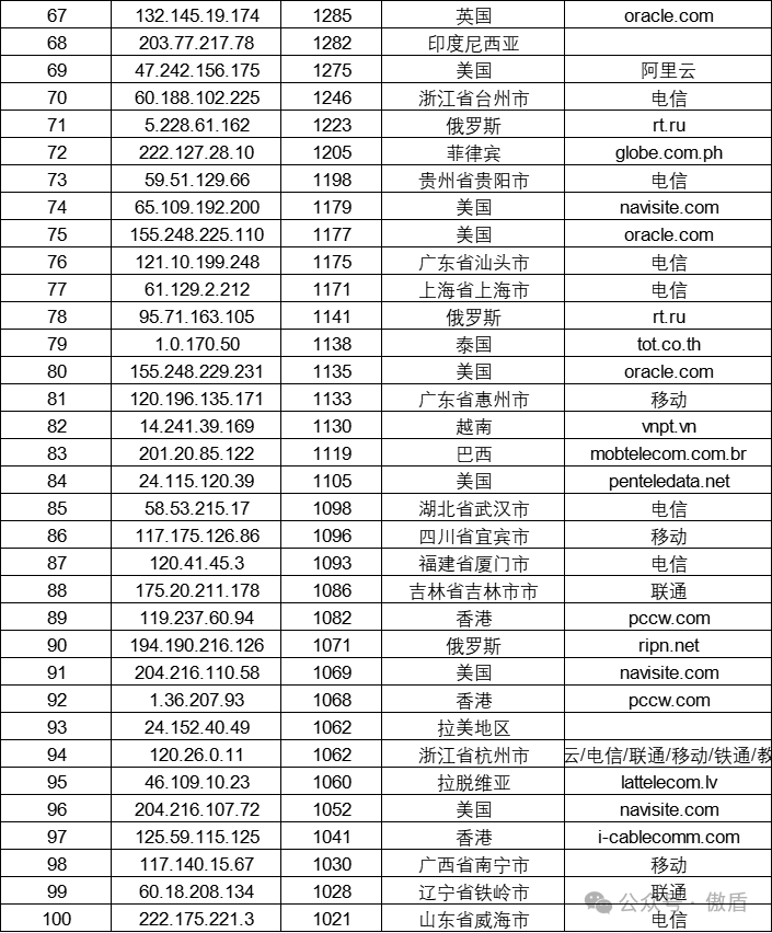 注:因IP地理位置库时效性原因属地与ISP线路仅供参考,另因DDoS攻击存在虚假源的可能,如引用下方攻击源数据至网络安全设备中,由此产生的风险与傲盾软件无关。