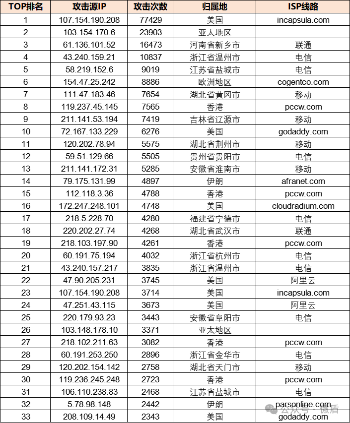 本月TOP攻击源显示,攻击IP地址分布范围广泛,既包含国内IP地址(如浙江省杭州市、湖北省武汉市),也包括多个境外IP来源(如美国、日本和巴西)。 其中,归属地显示为日本的IP地址(101.128.168.161)高频出现,攻击次数达到2,355,113次,显示出特定区域内存在高密度攻击源节点。此外,国外IP来源的高频出现也说明 了全球化的攻击趋势与多点协同攻击的复杂性。