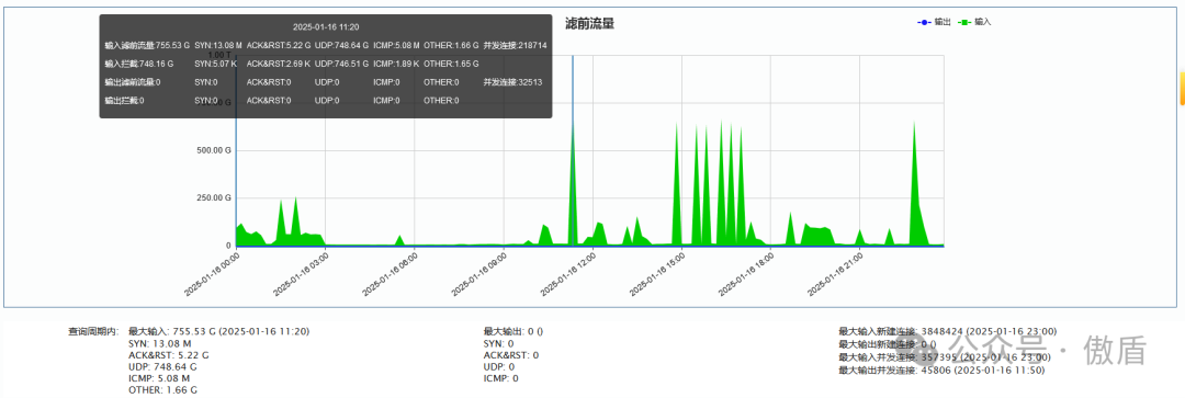 ►单次最大攻击流量 755.53 G 发生于 2025-01-16 11:20