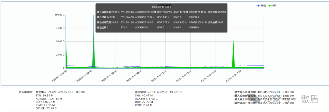 ►单次最大攻击流量 78.69 G 发生于2025-01-19 03:20