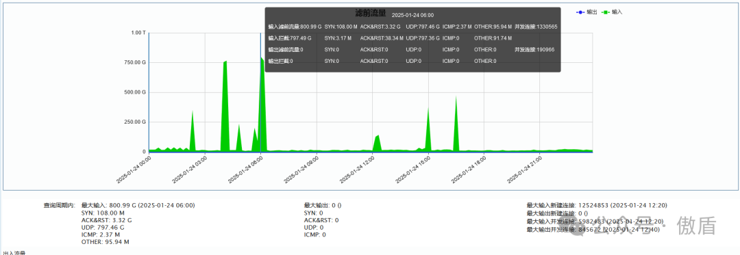 ►单次最大攻击流量 800.99 G 发生于 2025-01-24 06:00