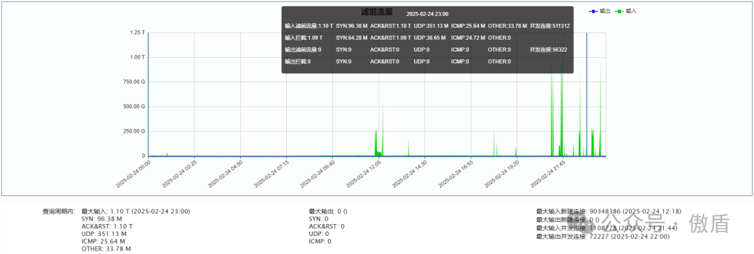 ►单次最大攻击流量1.10 T 发生于 2025-02-24 23:00