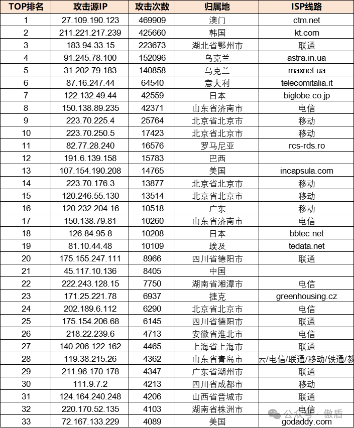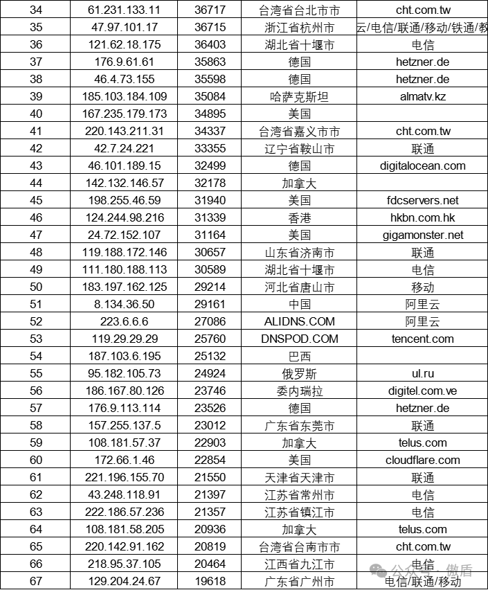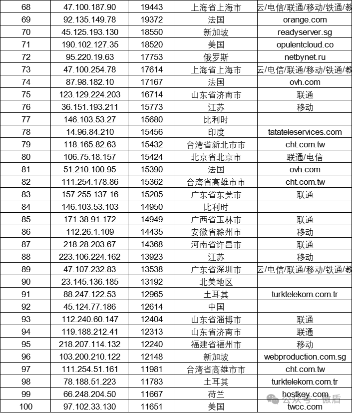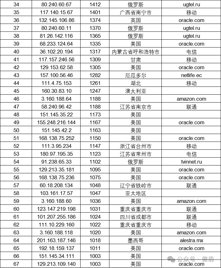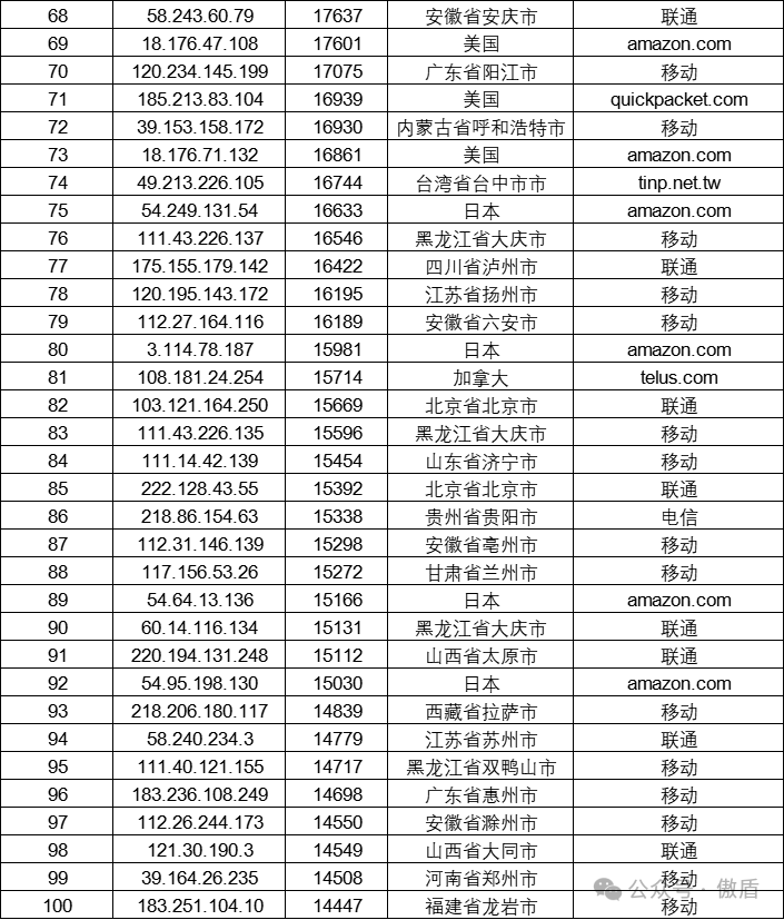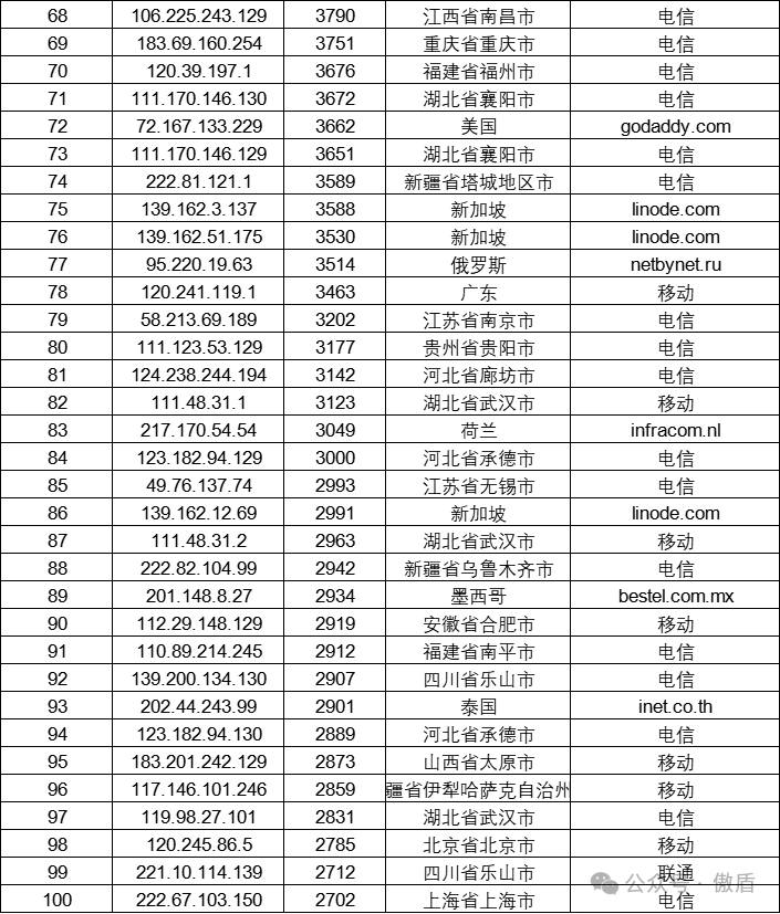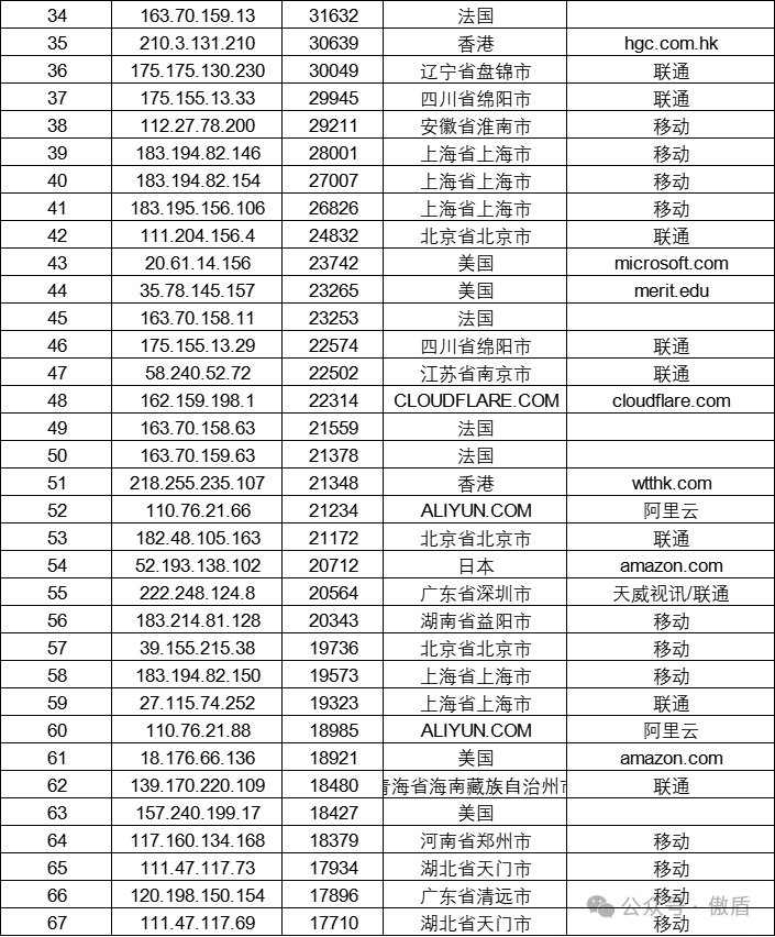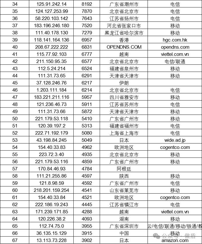 注:因IP地理位置库时效性原因属地与ISP线路仅供参考,另因DDoS攻击存在虚假源的可能,如引用下方攻击源数据至网络安全设备中,由此产生的风险与傲盾软件无关。