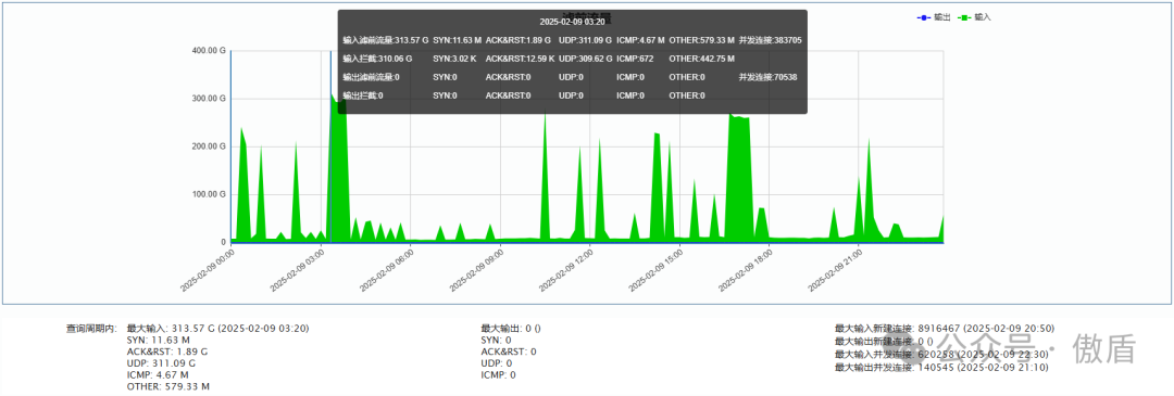 ►电信方向:单次最大攻击流量 313.57 G 于2025-02-09 03:20