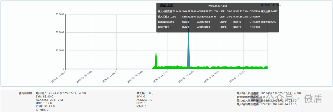 ►单次最大攻击流量 71.44G 发生于 2025-02-14 14:30