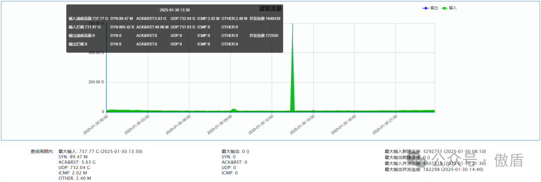 ►单次最大攻击流量 737.77 G 发生于 2025-01-30 13:30