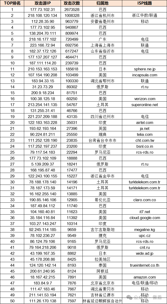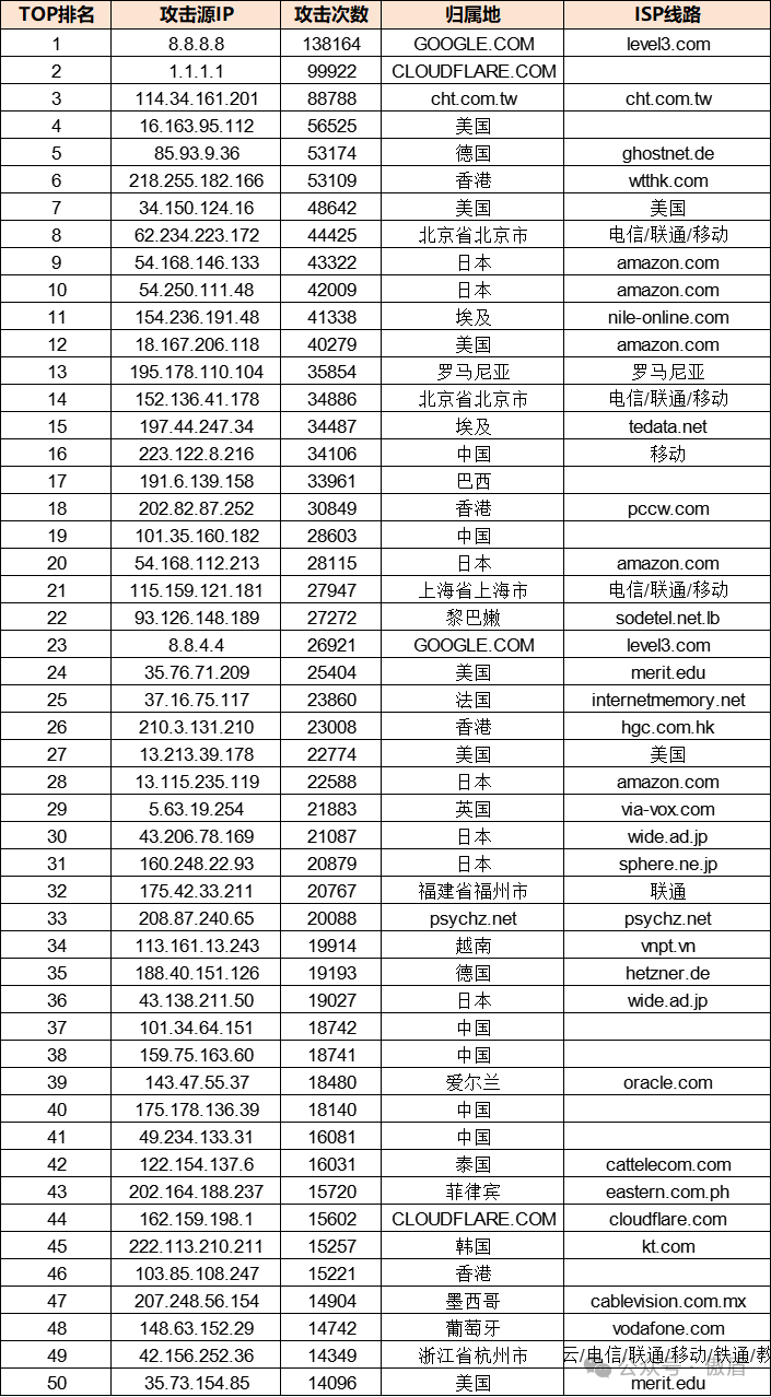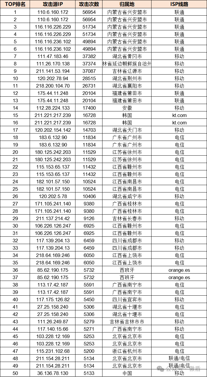 攻击源分布广泛,涵盖国内外多个地区,部分高频IP集中在南美、东南亚、东北亚等地区,同时也存在较多源IP伪造现象,追踪和溯源仍存在一定难度。