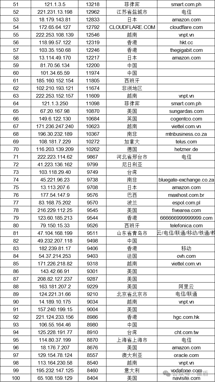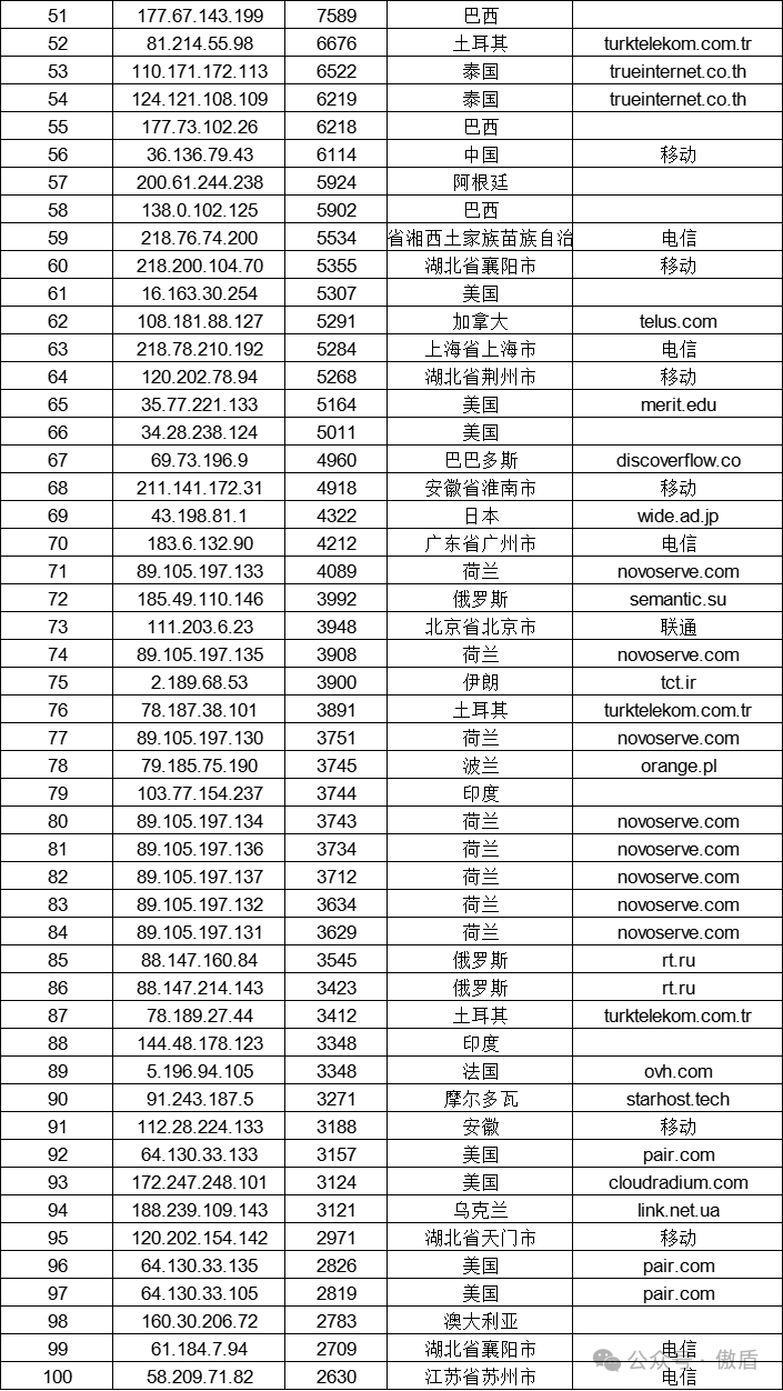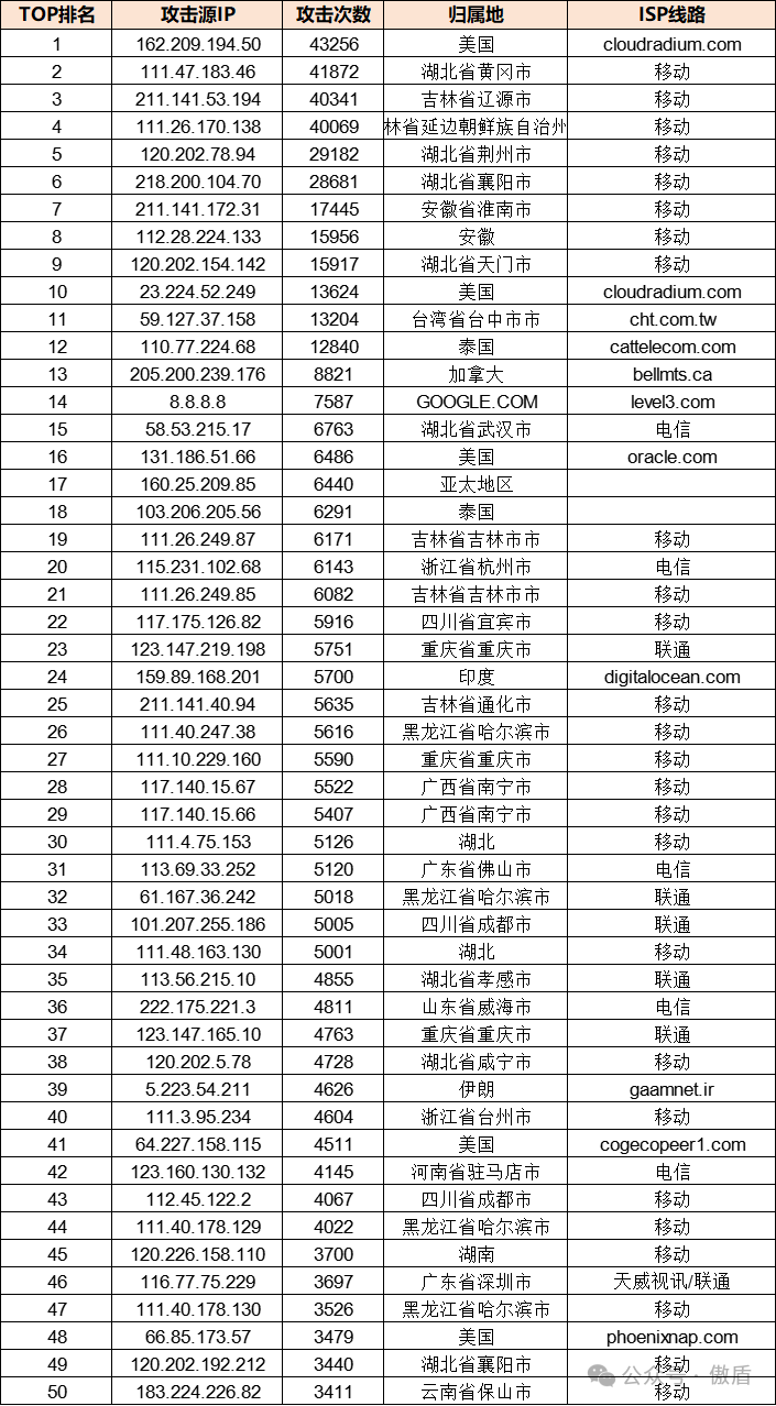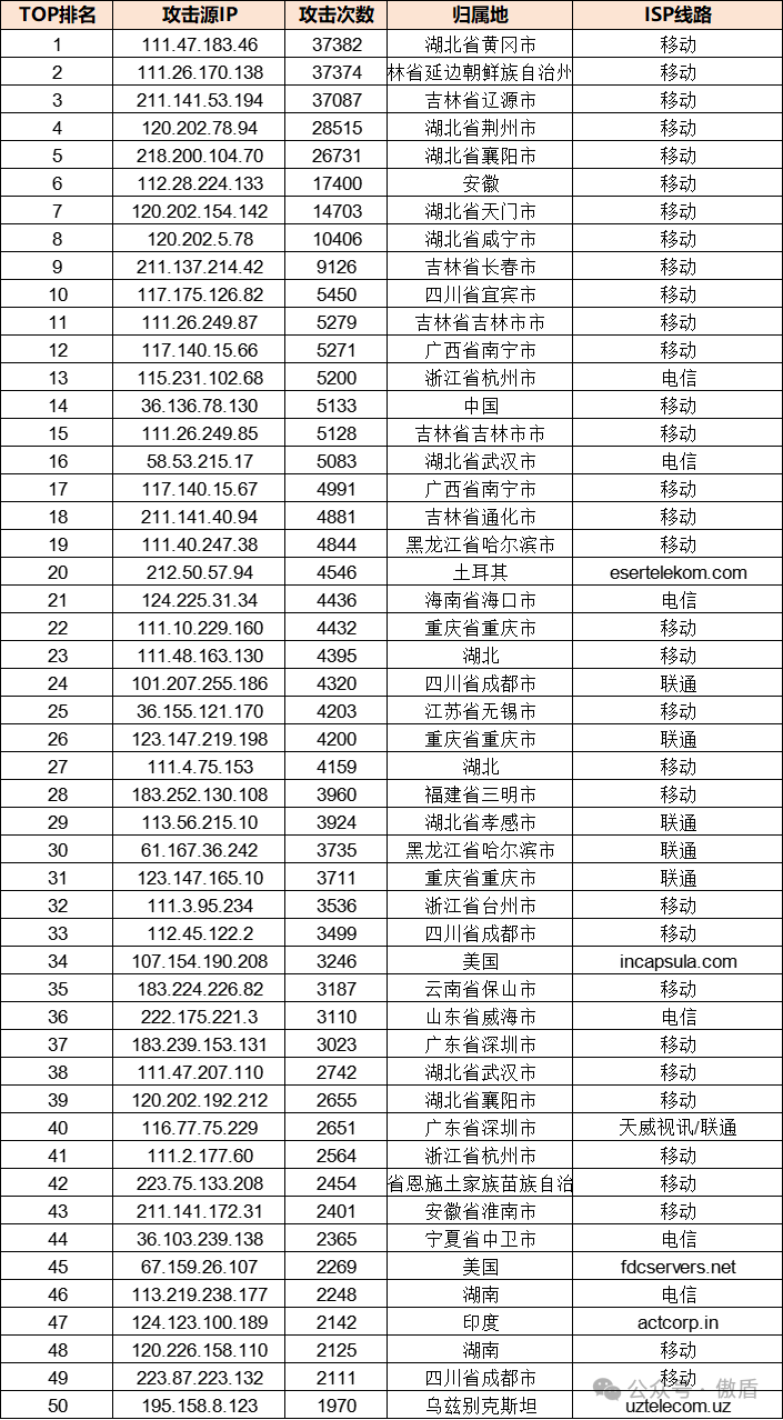 攻击源分布广泛,涵盖国内外多个地区,部分高频IP集中在南美、东南亚、东北亚等地区,同时也存在较多源IP伪造现象,追踪和溯源仍存在一定难度。