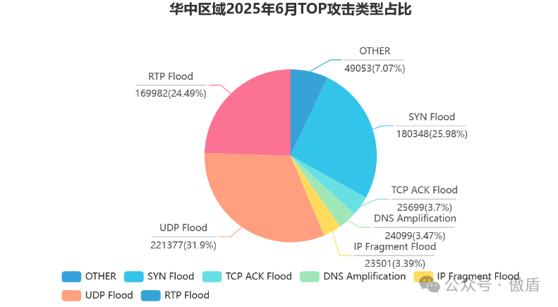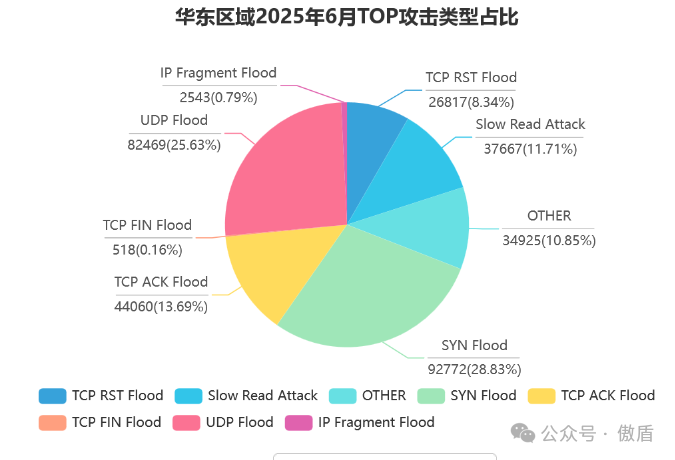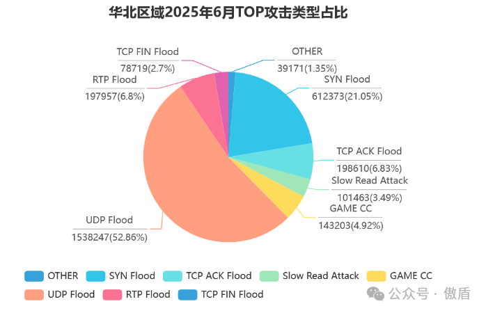 当前攻击以 UDP Flood 为核心战术,在华北、华中、北美等地均占主导地位,攻击者通过反射放大技术制造超大规模流量,部分攻击中 UDP 流量占比超 95%。 TCP 类攻击(如 SYN Flood、ACK Flood)作为辅助手段,在华东、华北等地占比约 20%-30%,形成 “流量压制 + 连接耗尽” 的组合威胁。