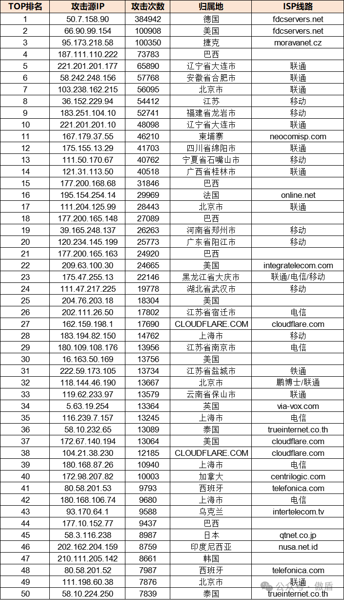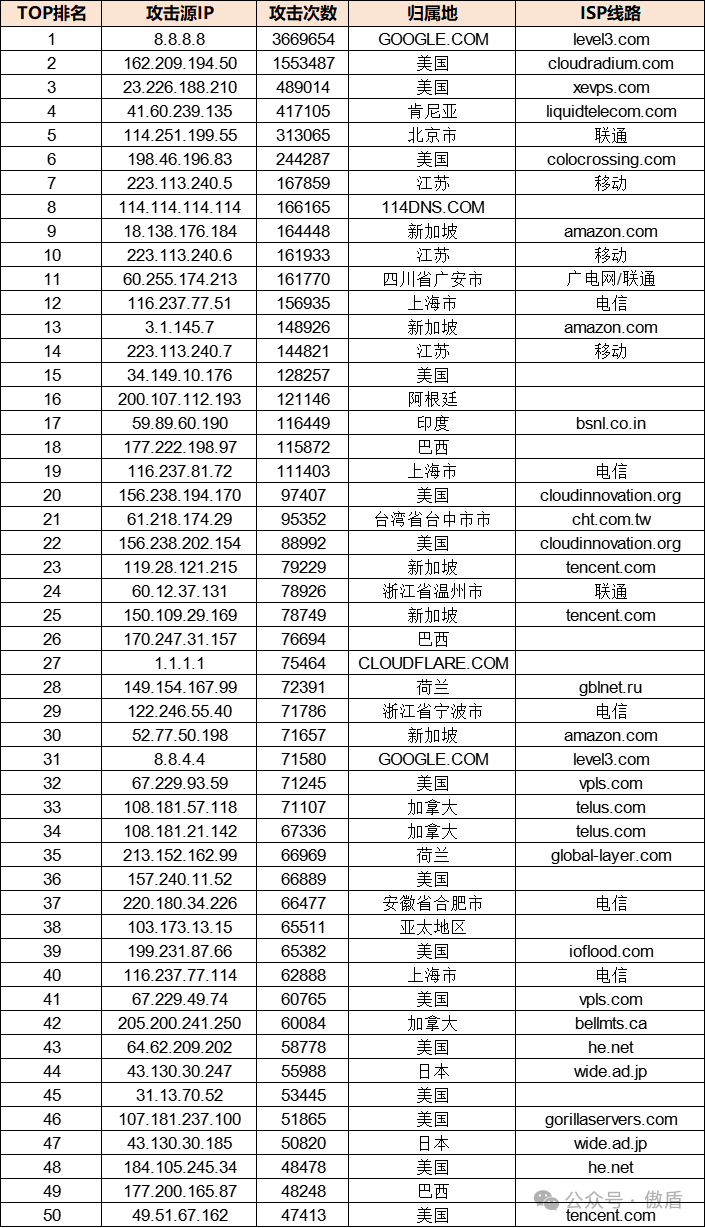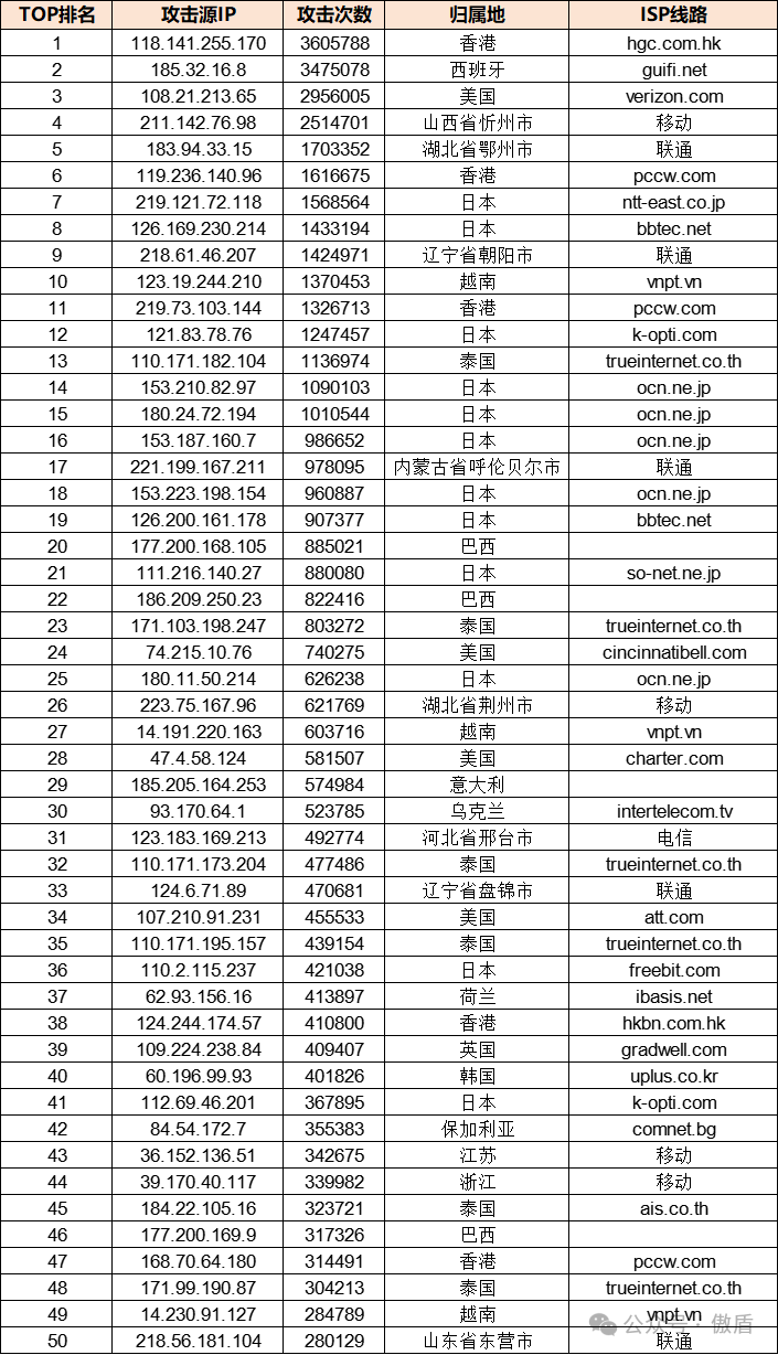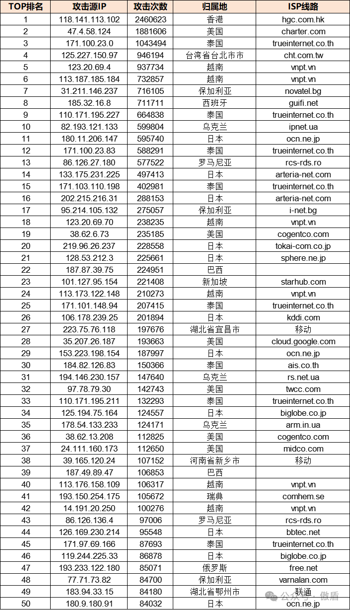 免责声明:因 IP 地理位置数据库存在更新延迟,报告中显示的属地和运营商信息仅供参考。鉴于 DDoS 攻击流量中可能存在虚假源 IP, 如您将下列攻击源信息应用于网络安全设备策略,由此产生的误判或误拦后果,傲盾软件概不承担相关责任。