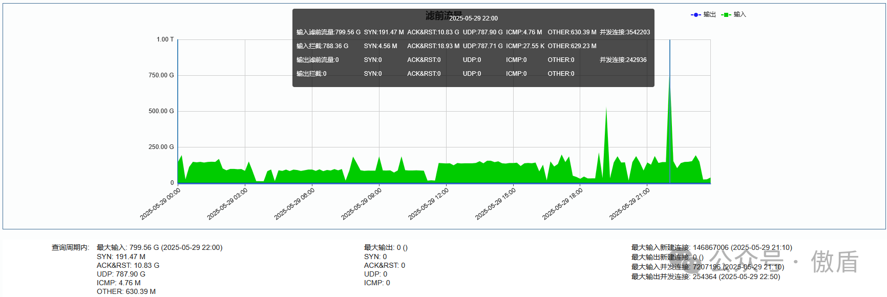 ►单次最大攻击流量 799.56 G 发生于 2025-05-29 22:00