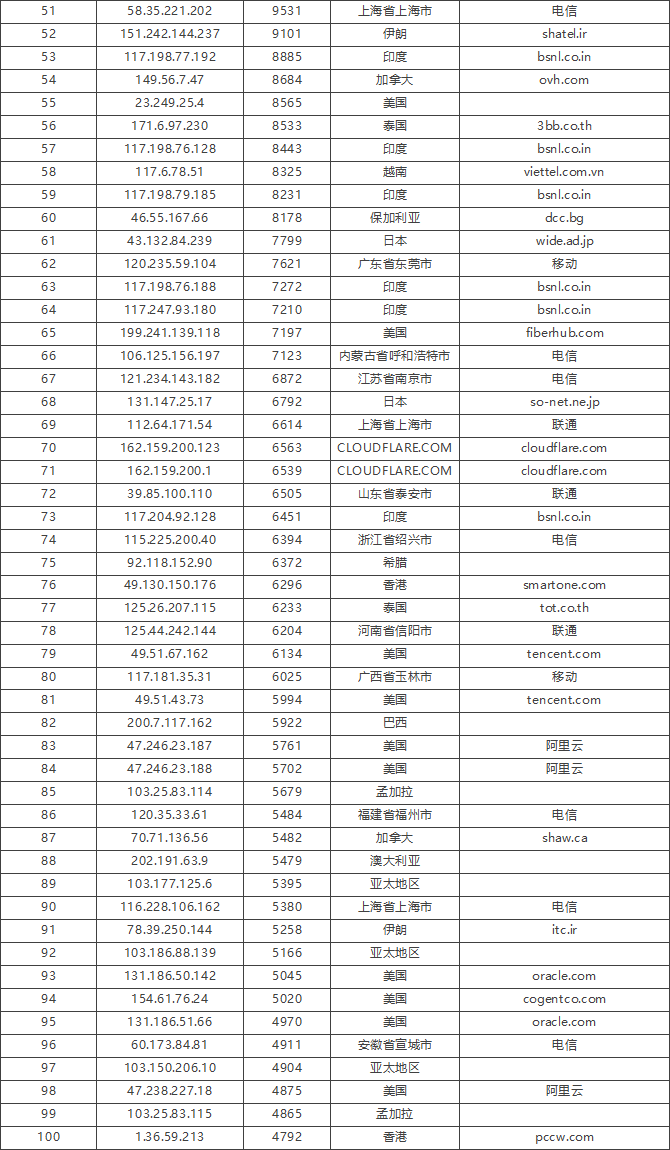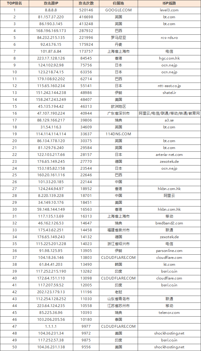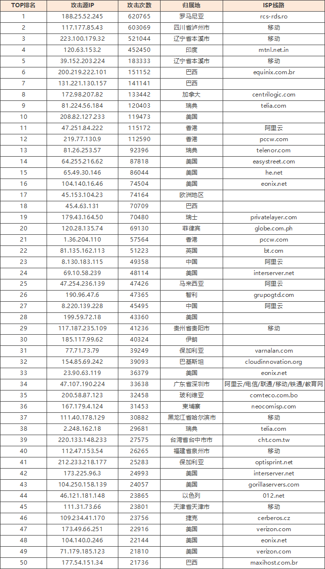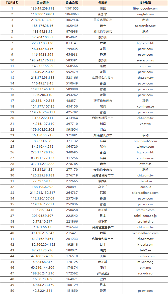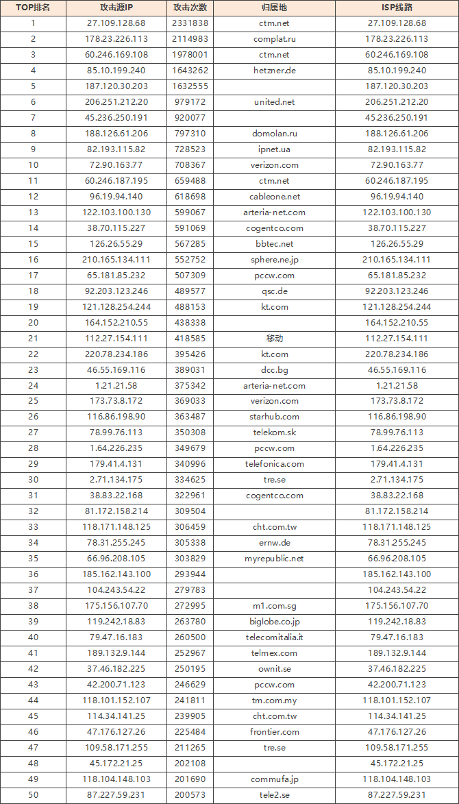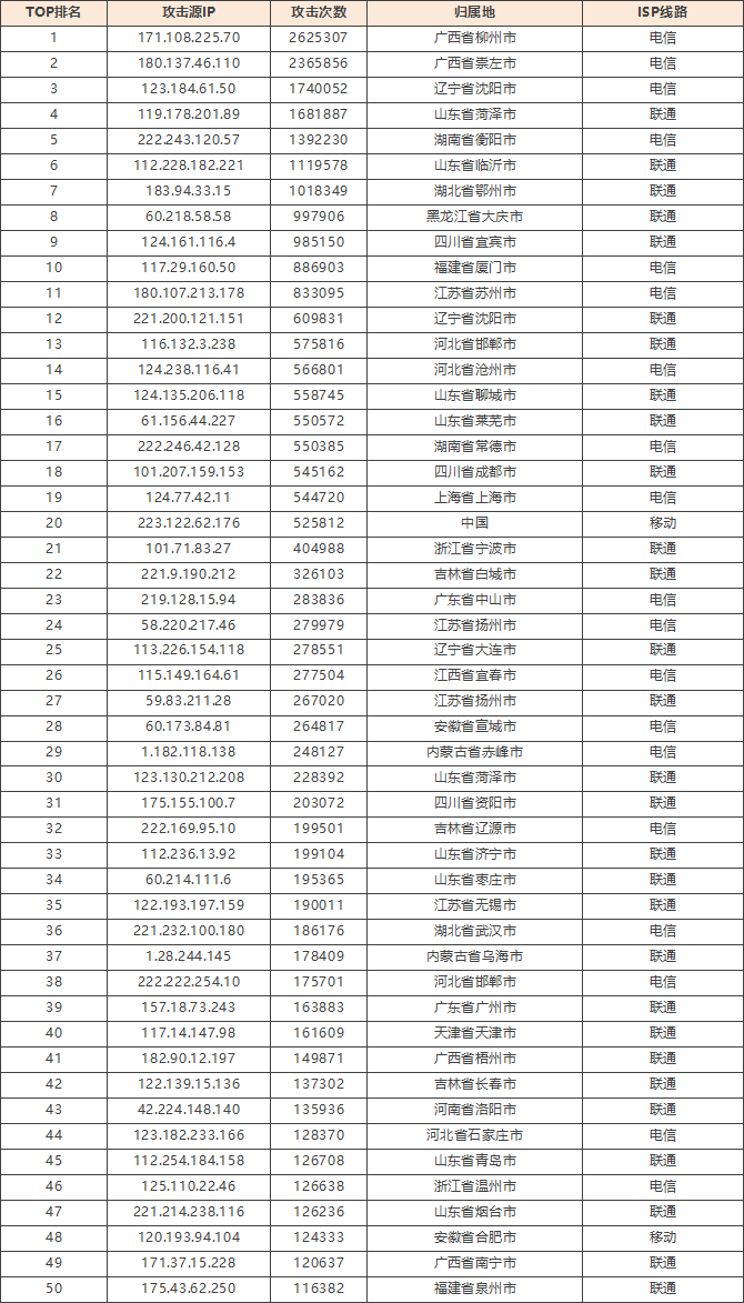 免责声明:因 IP 地理位置数据库存在更新延迟,报告中显示的属地和运营商信息仅供参考。鉴于 DDoS 攻击流量中可能存在虚假源 IP, 如您将下列攻击源信息应用于网络安全设备策略,由此产生的误判或误拦后果,傲盾软件概不承担相关责任。