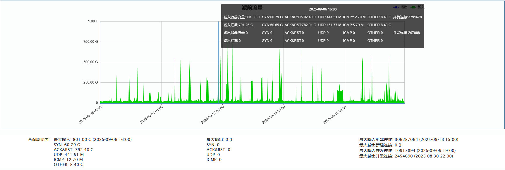 ►单次最大攻击流量801.00 Gbps发生于 2025-09-06 16:40至16:50时段)