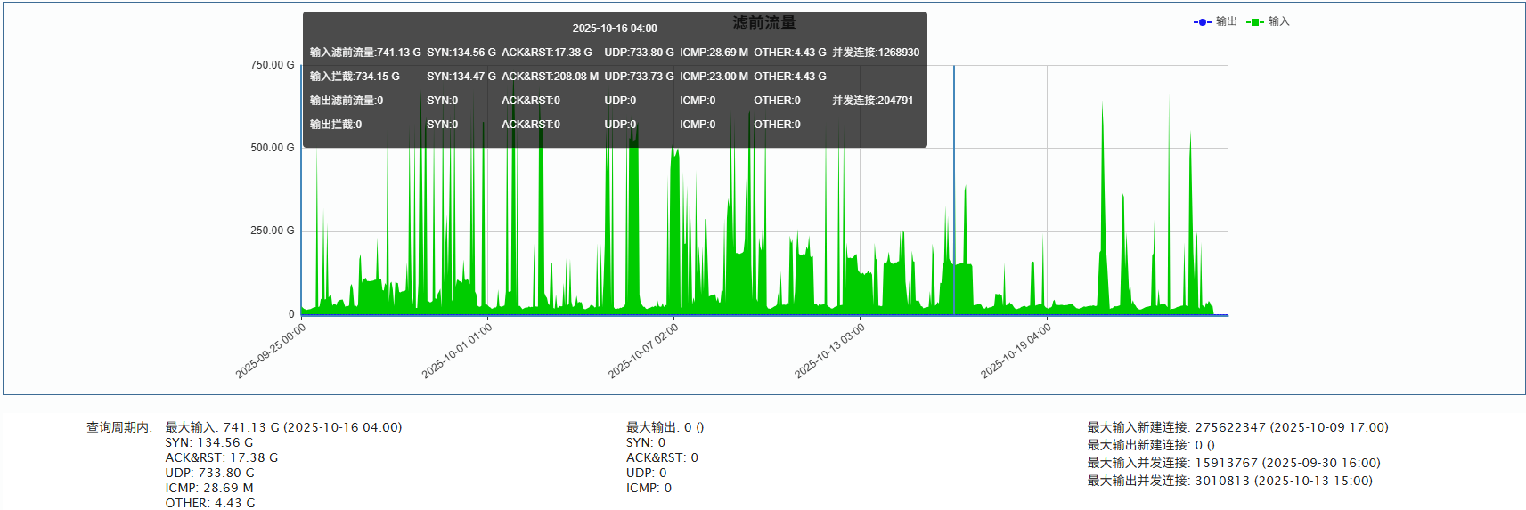 ►单次最大攻击流量 741.13Gbps (发生于 2025-10-16 03:50至04:00时段)