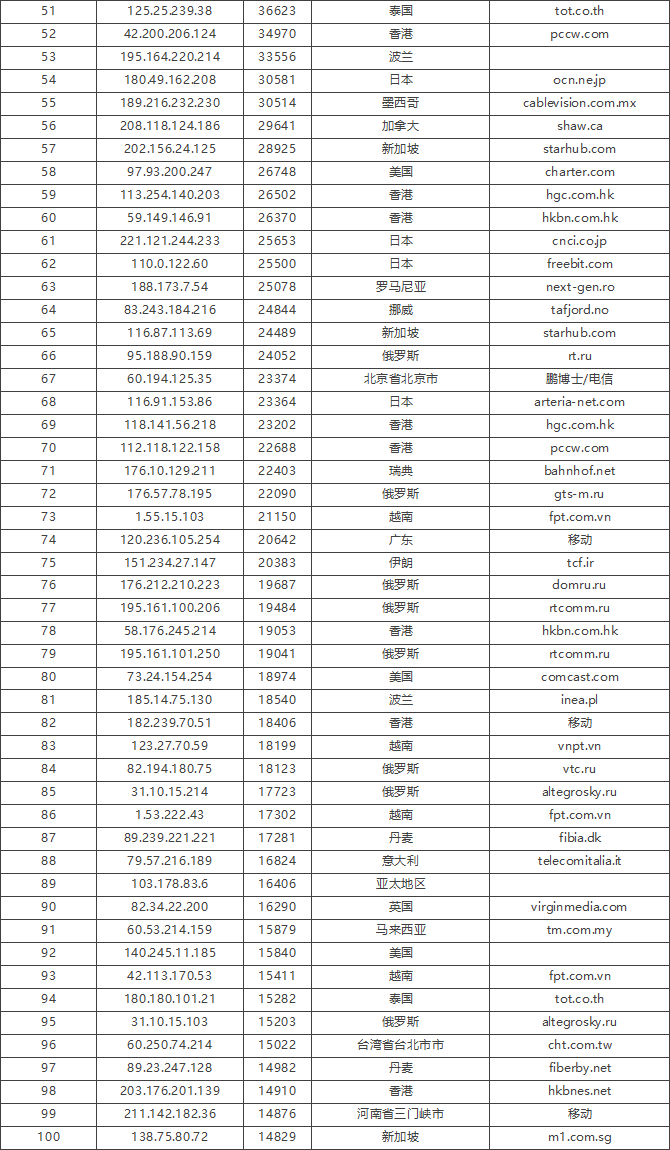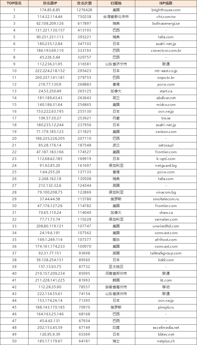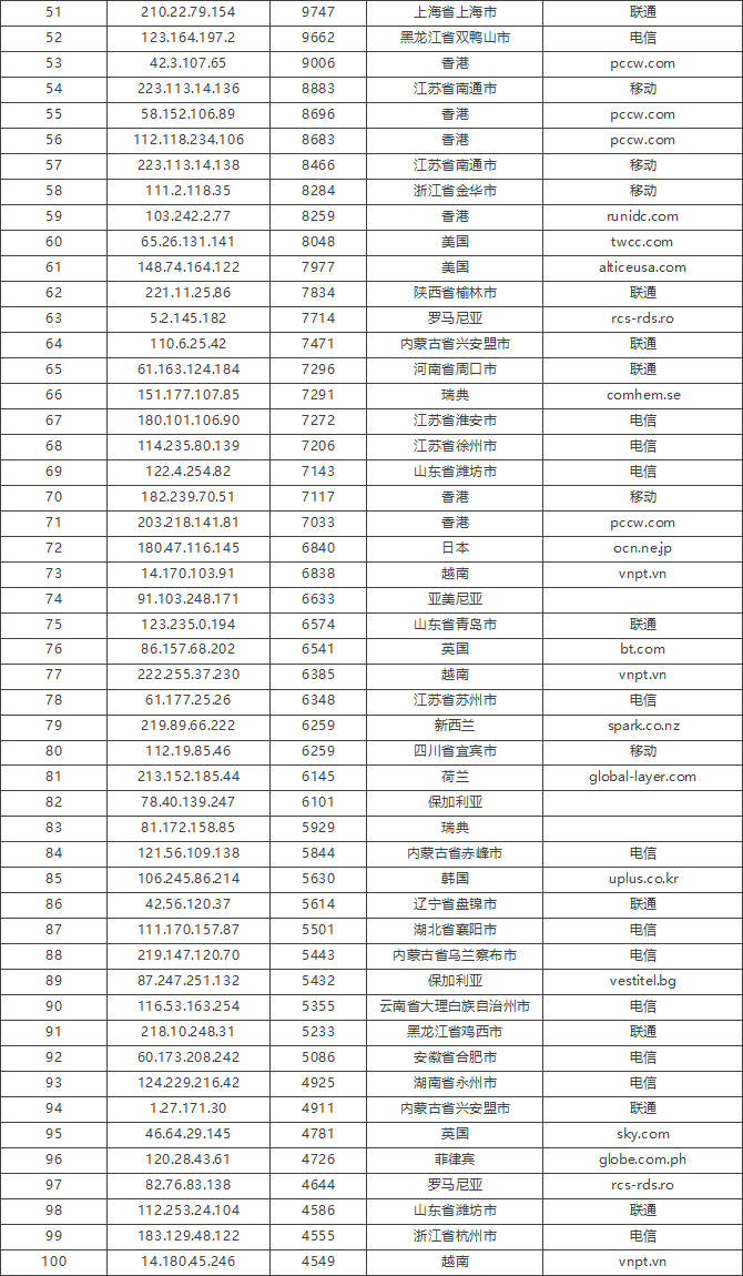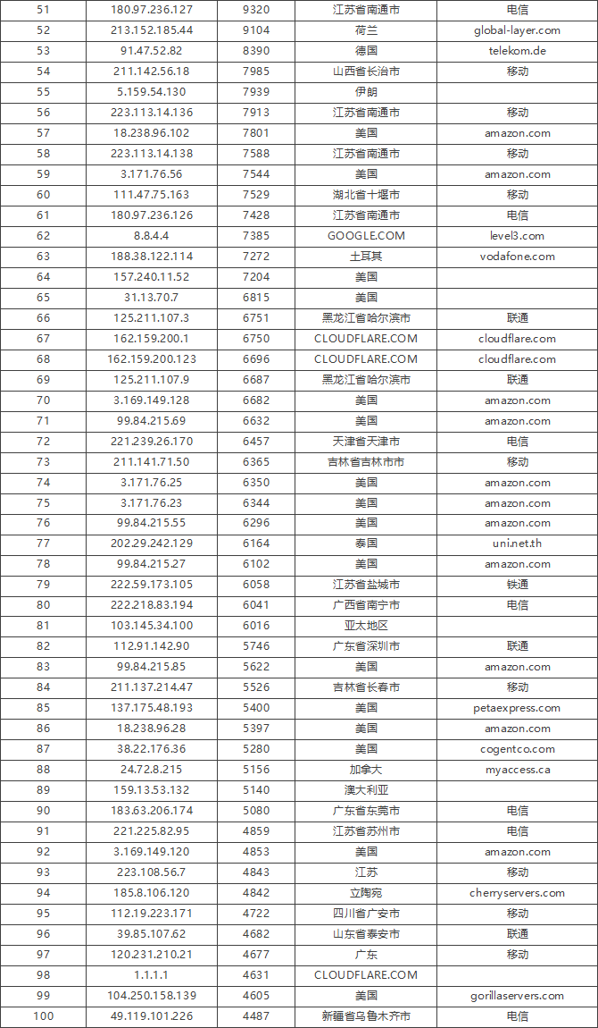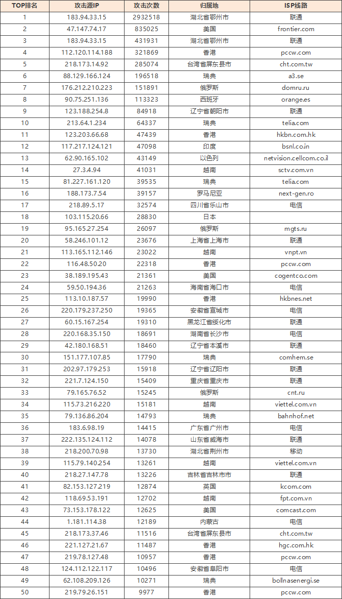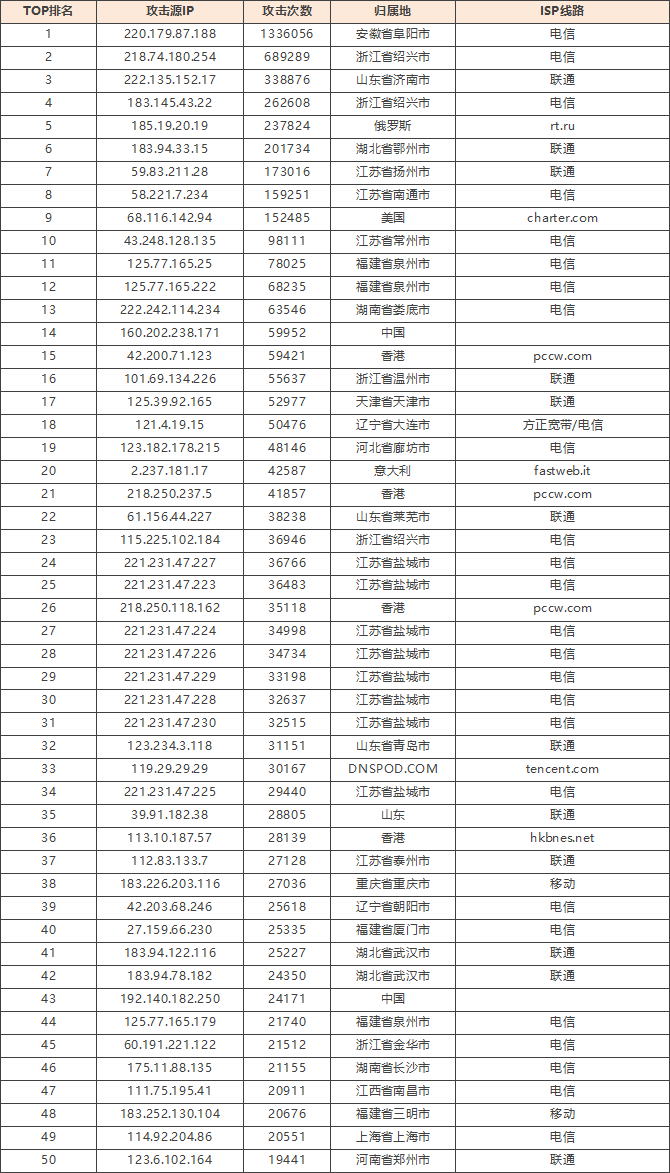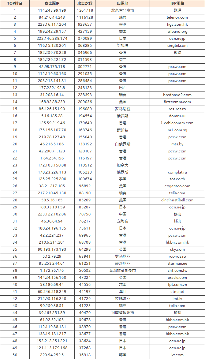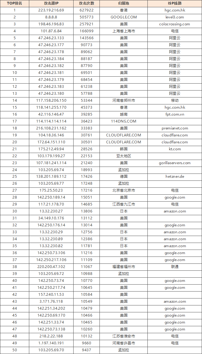 免责声明:因 IP 地理位置数据库存在更新延迟,报告中显示的属地和运营商信息仅供参考。鉴于 DDoS 攻击流量中可能存在虚假源 IP, 如您将下列攻击源信息应用于网络安全设备策略,由此产生的误判或误拦后果,傲盾软件概不承担相关责任。