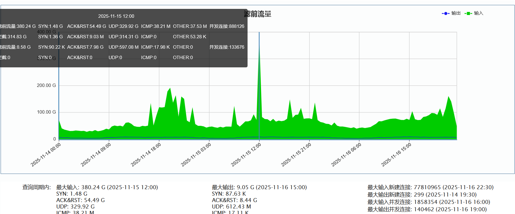 ►电信方向:单次最大攻击流量为380.24 Gbps(发生于2025-11-15 11:50至12:00时段)