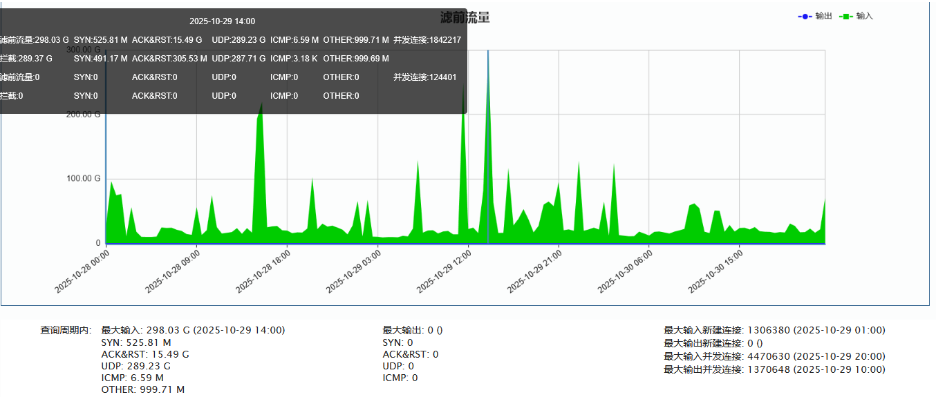 ►移动方向:单次最大攻击流量为298.03 Gbps(发生于 2025-10-29 13:50 至 14:00时段)