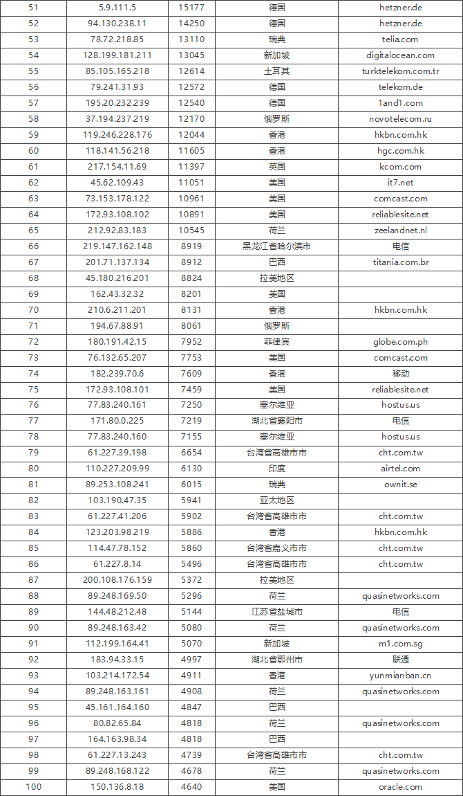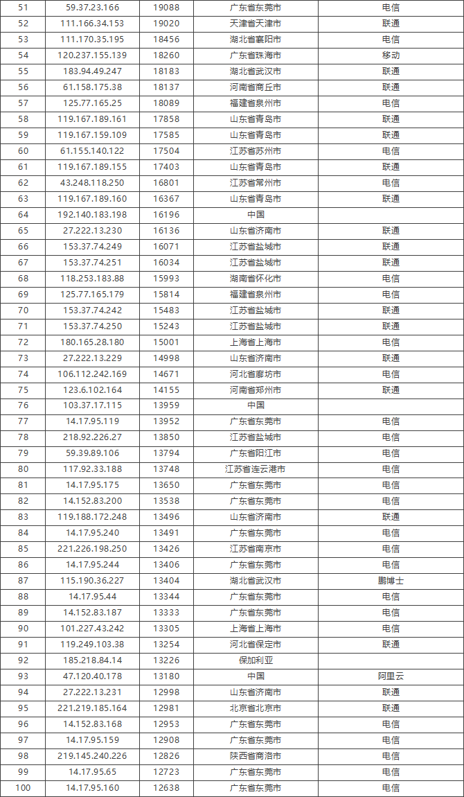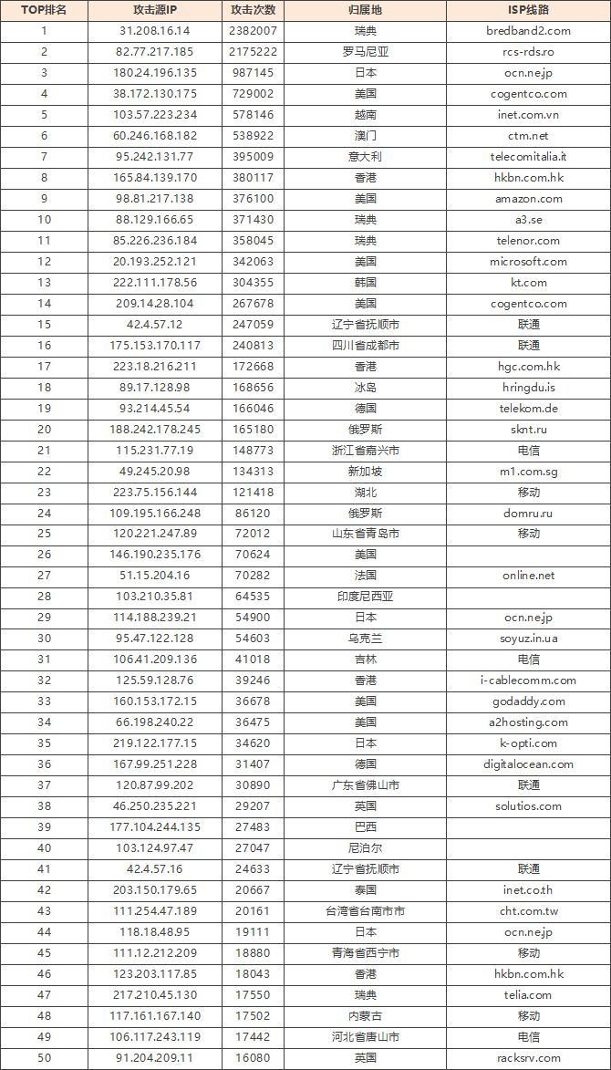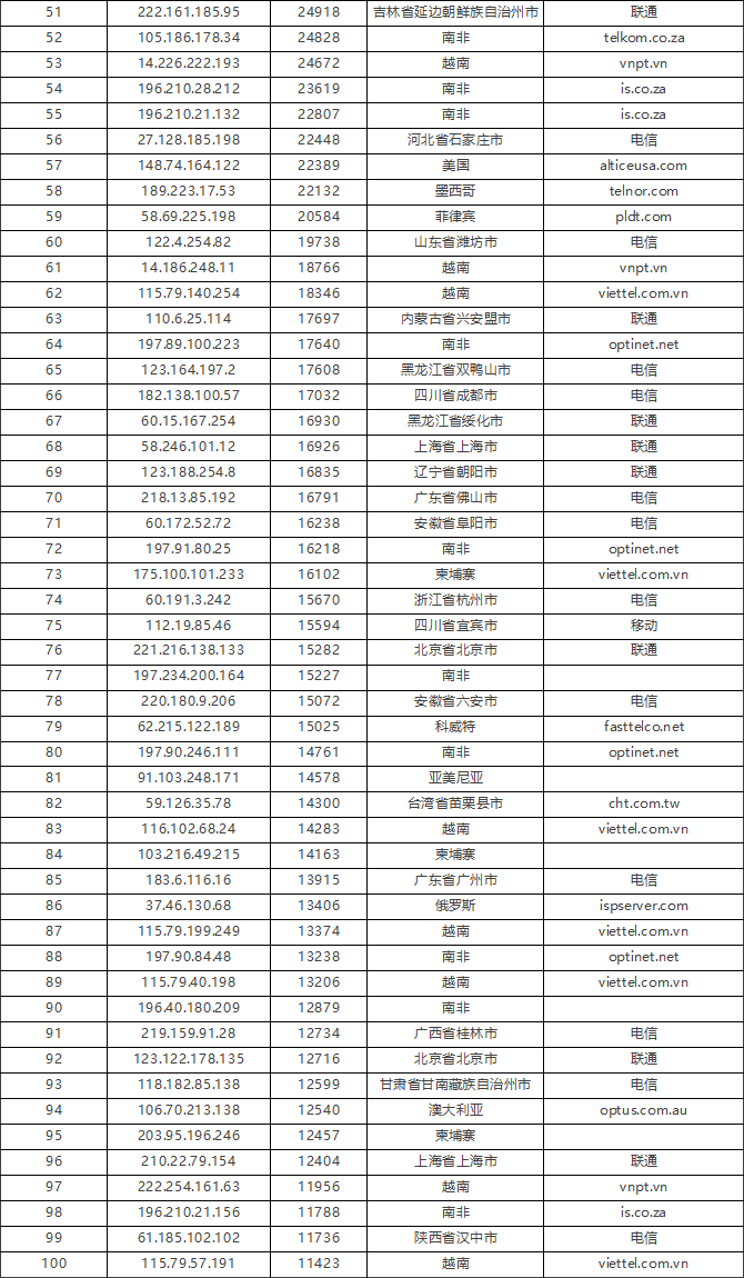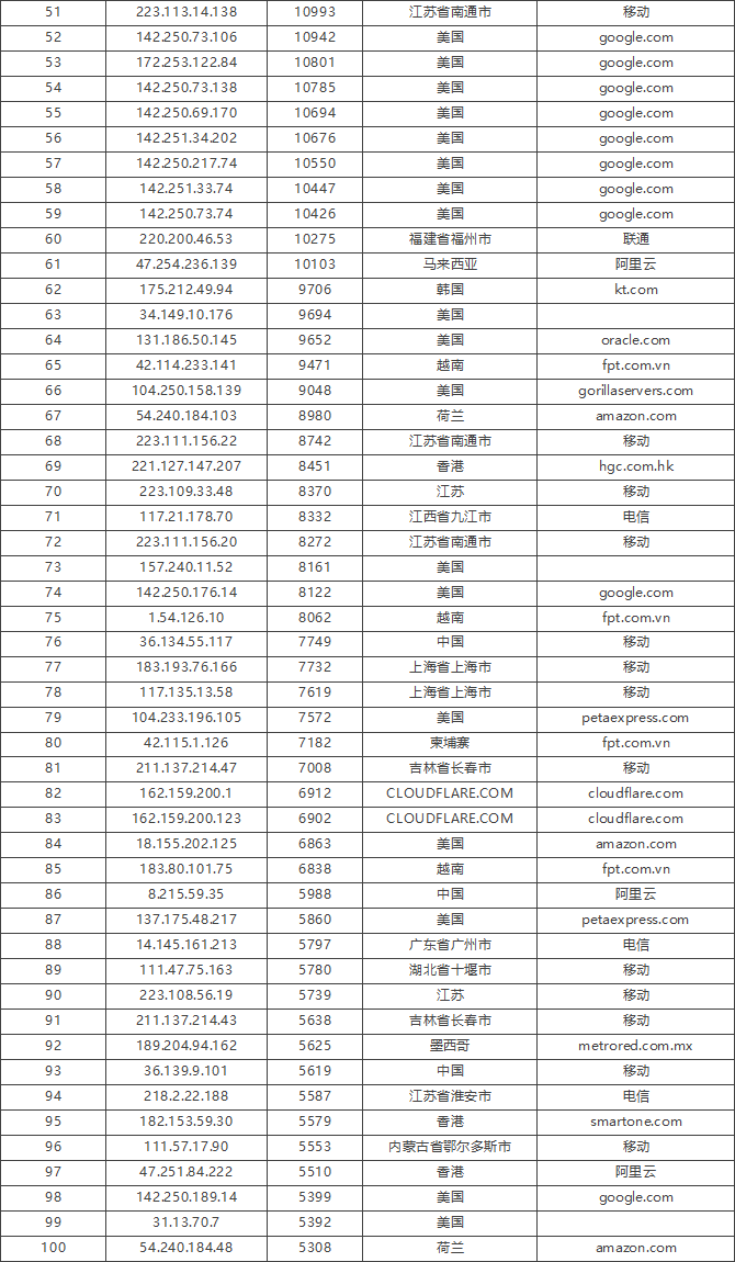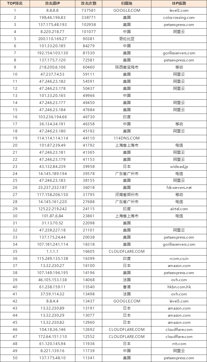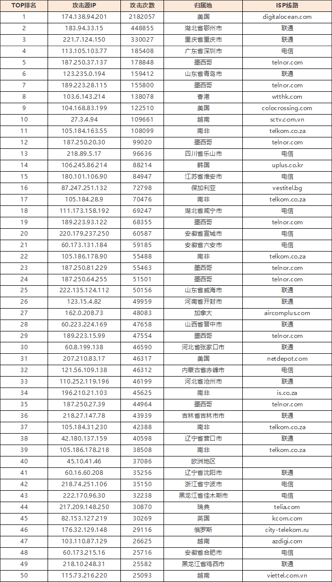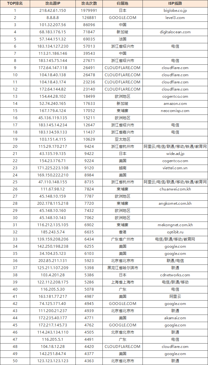 免责声明:因 IP 地理位置数据库存在更新延迟,报告中显示的属地和运营商信息仅供参考。鉴于 DDoS 攻击流量中可能存在虚假源 IP, 如您将下列攻击源信息应用于网络安全设备策略,由此产生的误判或误拦后果,傲盾软件概不承担相关责任。