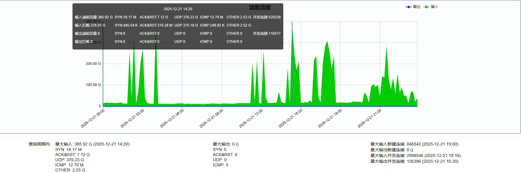 ►移动方向:单次最大攻击流量为385.92 Gbps(发生于 2025-12-21 14:20 至 14:30时段)