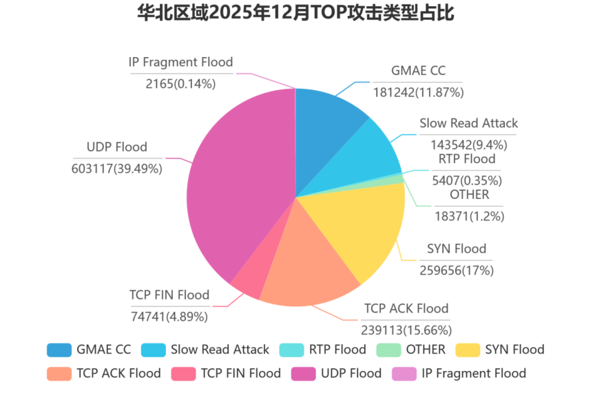 华东区域——攻击总次数达 208,572 次,单次最大攻击流量突破 1.01Tbps,创下区域攻击流量峰值新高。攻击强度不容小觑。 从攻击类型来看,UDP Flood 以 26.28% 的占比位居首位,SYN Flood 紧随其后,占比 23.34%,两者合计占据近半数攻击场景, 呈现出传统攻击与针对性攻击并存的特点。