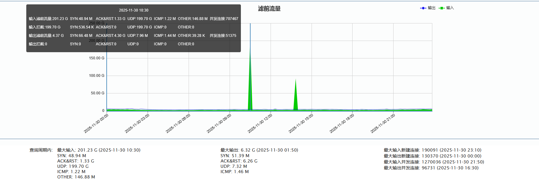 ►单次最大攻击流量201.23 Gbps(发生于 2025-11-30 10:30至10:40时段)