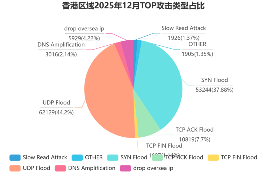 香港区域——呈现 “长时压制、低峰高频” 的独特攻击特征。攻击类型集中度极高,UDP攻击方式相对单一但持续性强,主要以消耗目标系统资源为目的。