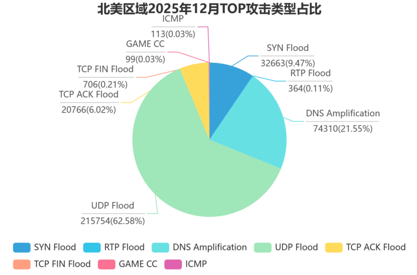 北美区域——攻击类型呈现 “一主一辅” 格局,UDP Flood 以 62.58% 的绝对占比成为主流,DNS Amplification(21.55%)占比显著, 其余攻击类型占比较低;攻击来源具有鲜明的全球化特征,涵盖美国、日本、印度等多个国家和地区,包含大量云厂商节点、CDN 节点及公共 DNS 的异常流量, 溯源难度较大。