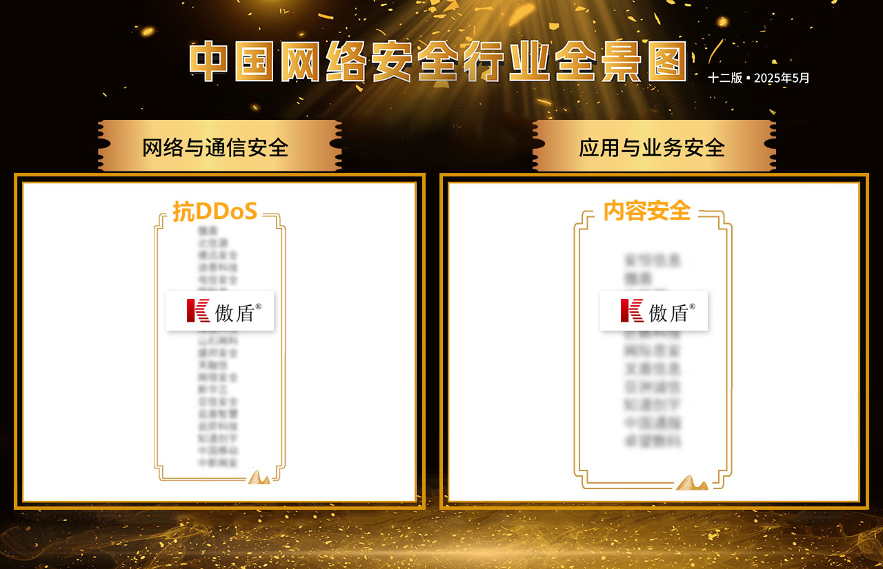 2025年5月9日,安全牛第十二版《中国网络安全行业全景图》正式发布,傲盾实力入选抗DDOS、内容安全二项细分领域。