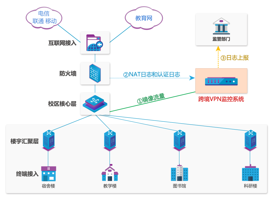 某省XX学院(以下简称“学院”)在校师生5000多人,其校园网络不仅承载着日常的教学、科研活动,还服务于行政管理和学生生活等多个方面。随着信息技术的发展和互联网应用的普及, 学院的网络环境变得日益复杂,特别是近年来加密通信技术的广泛应用,使得传统的网络安全管理措施逐渐显得力不从心。