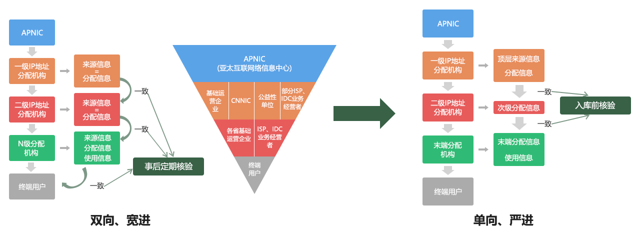 示例:接入商从APNIC获得IP地址,接入商需进行IP来源报备以及对应的IP分配报备。