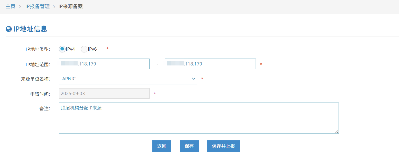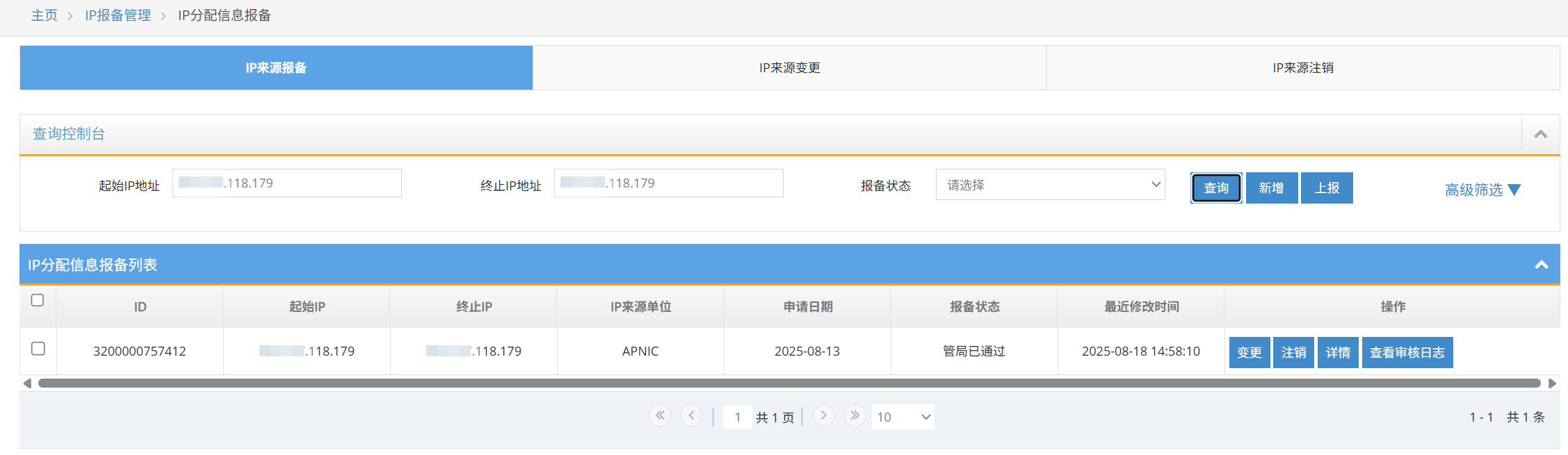 ④ 若要对已报备IP范围进行缩小,则提交变更来源拆分IP段后,再对归还上级的IP段进行注销来源操作