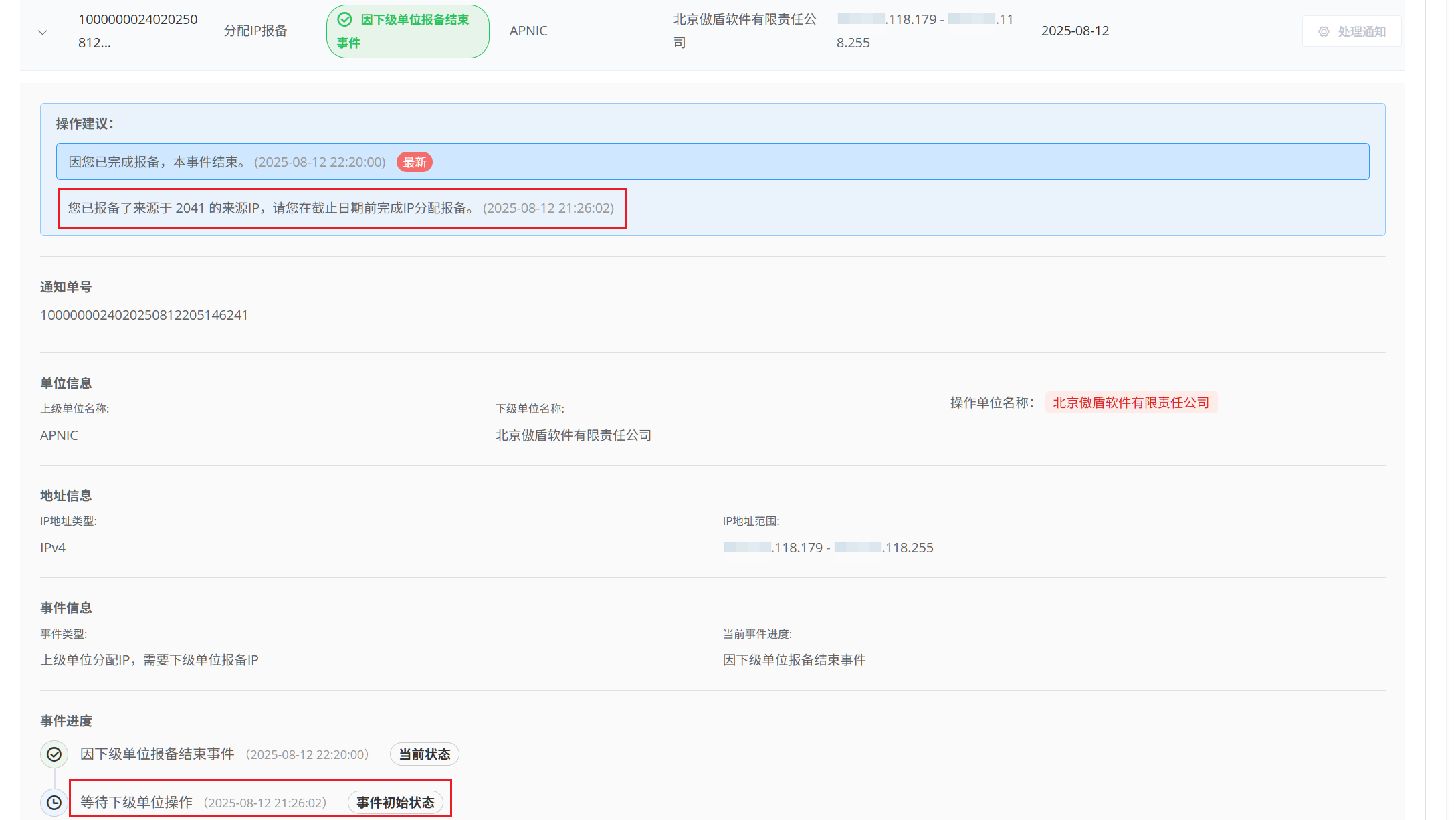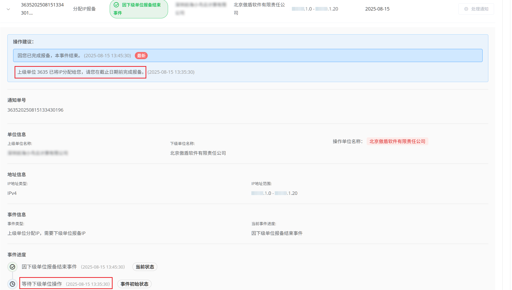 第一步:企业侧接到IP报备通知,通知类型为IP分配报备且事件进度为:待下级单位操作。