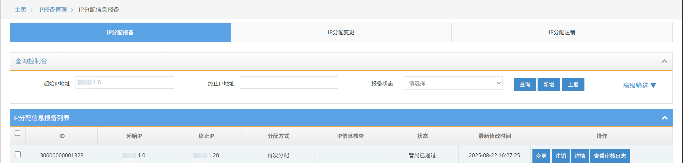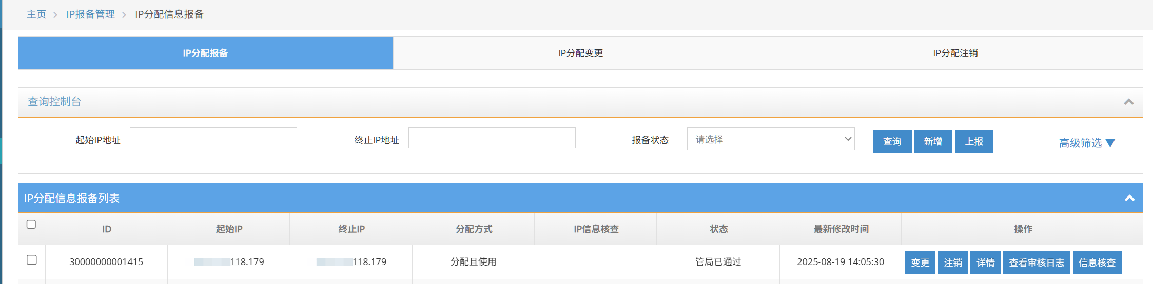 第二步:企业侧进行IP分配报备且报备通过,报备通过后上下游报备单位均接到IP报备通知,通知提示本次IP分配报备结束。