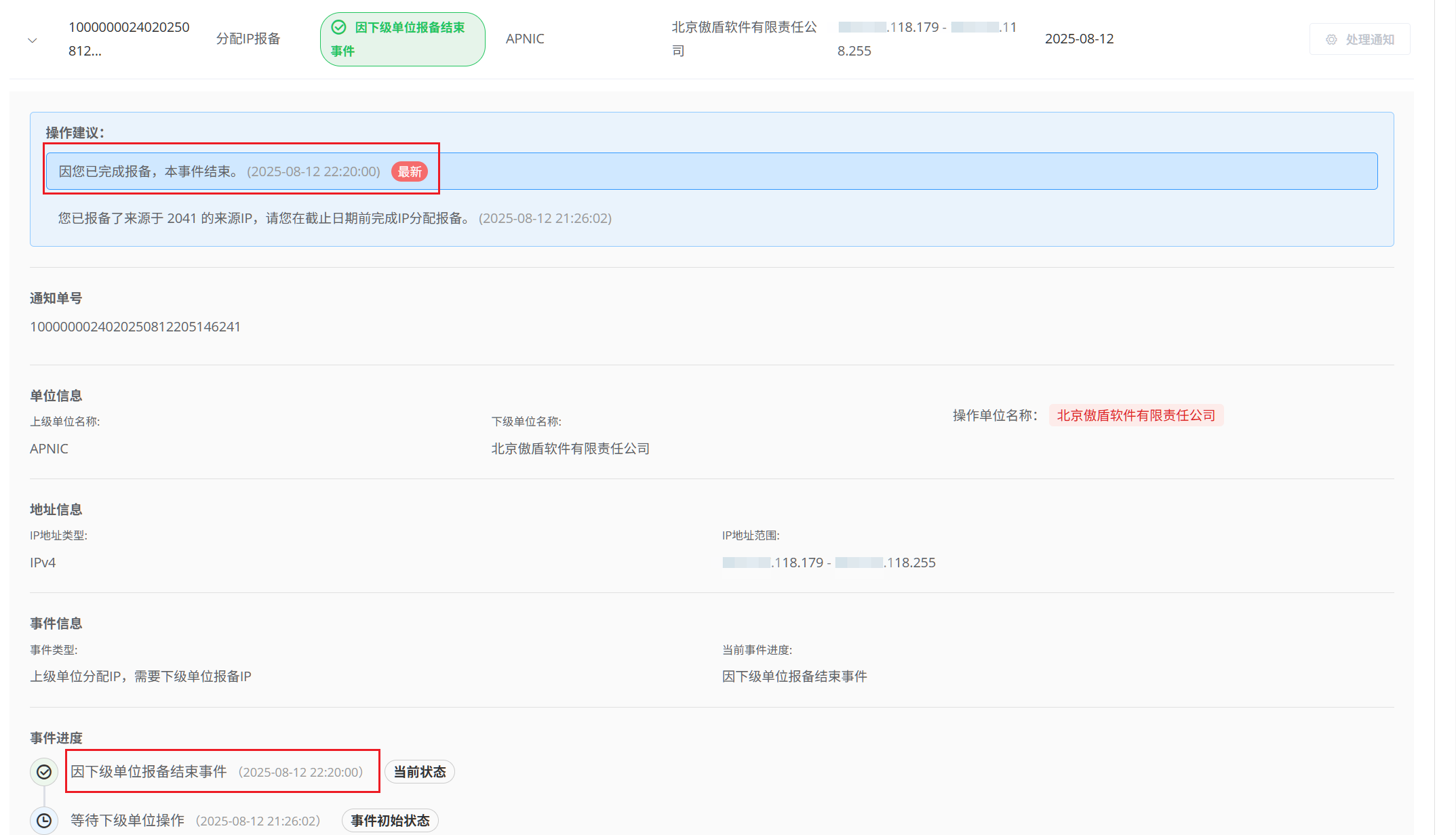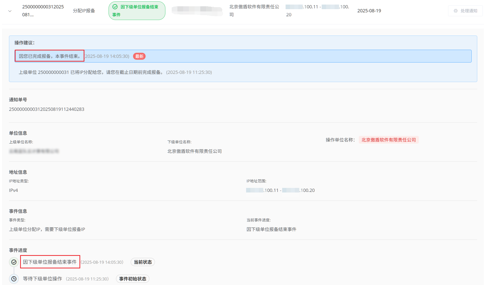 第二步结果:IP分配报备成功且接收到最新IP报备通知,通知为:下级单位完成IP分配报备,本次IP来源报备完成(IP地址来源以及其分配均已报备)。