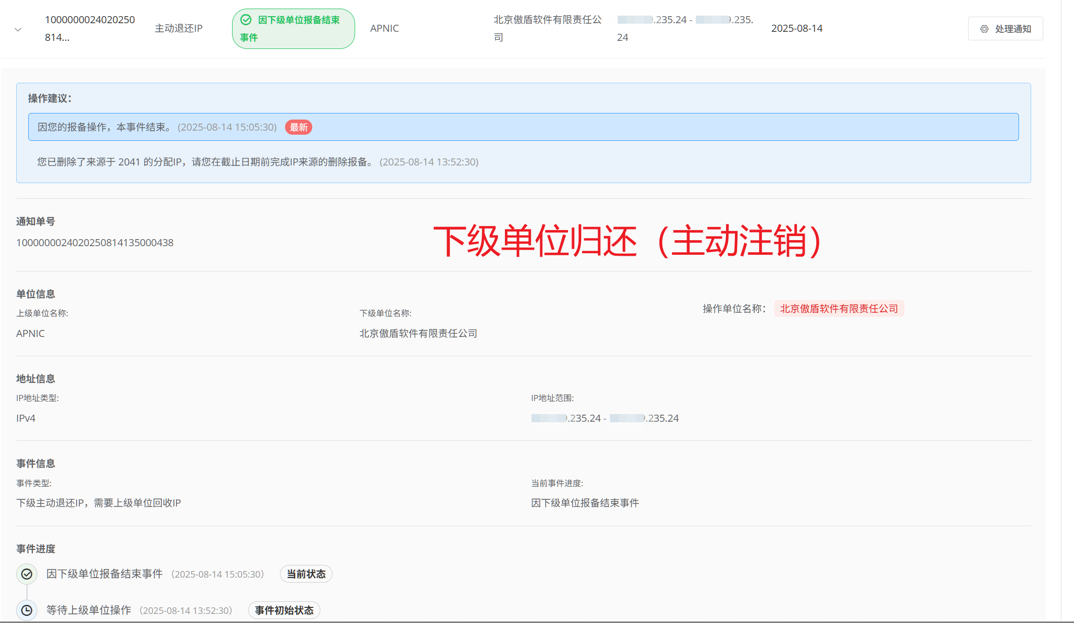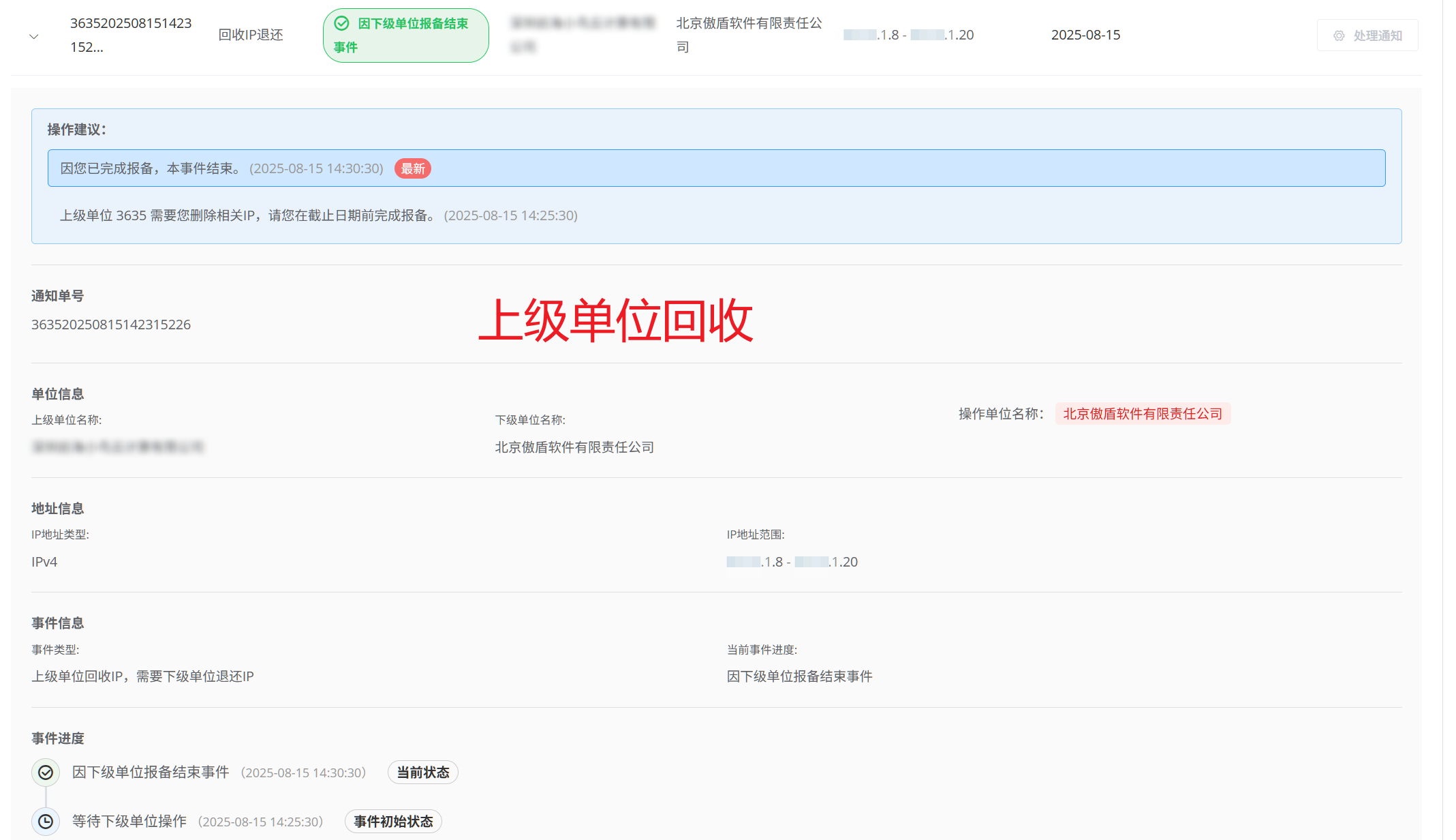 上级报备单位发起IP分配注销,需下级单位(本接入商)配合进行IP分配注销。