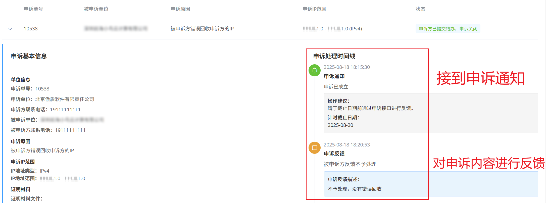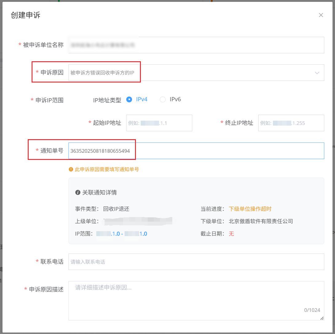 示例:上级报备单位错误回收我司IP地址,我方主动发起申诉